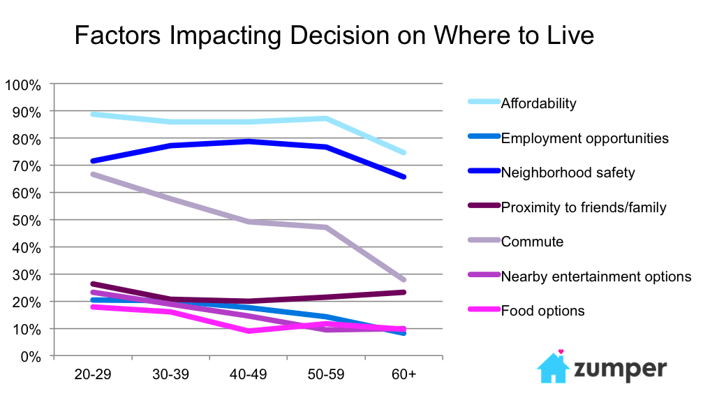 Demographic changes have contributed heavily to the downturn in homeownership. The percentage of Americans living in cities has steadily been climbing over the past few decades, where homeownership rates are typically lower. Our survey results also suggest that age is a large determinant on the factors that impact where renters moved.