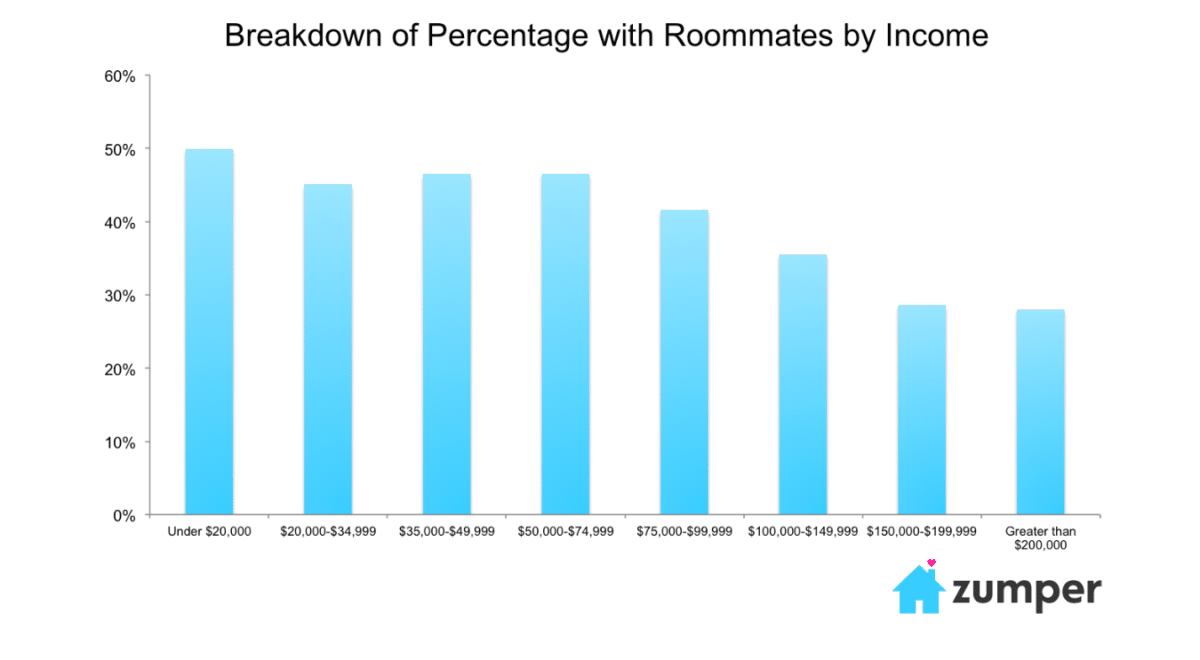 Results from the American Community Survey place the percentage of all Americans living with a roommate at almost 8%, but more than 45% of our surveyed renters were living with a roommate.