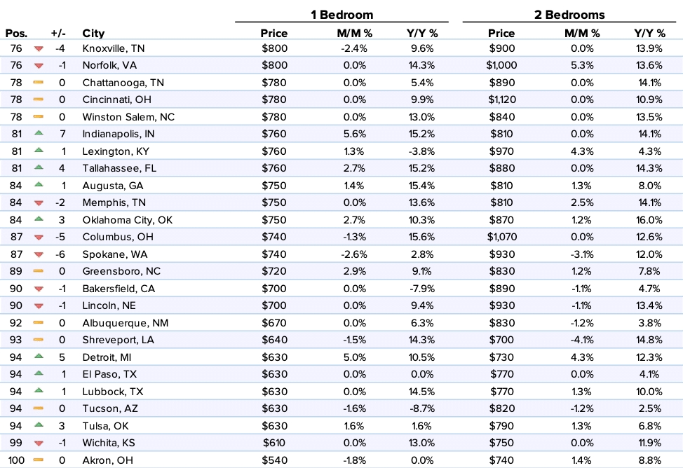 –Indianapolis, IN moved up 7 spots to become the 81st priciest city and had the largest one bedroom rental growth rate in the nation, up 5.6% to $760.