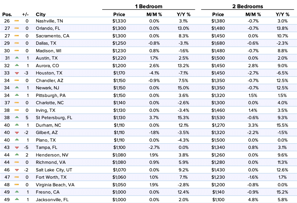 | 33 | Houston, TX | $1,170 | -4.10% | -7.10% | $1,450 | -2.70% | -6.50% |