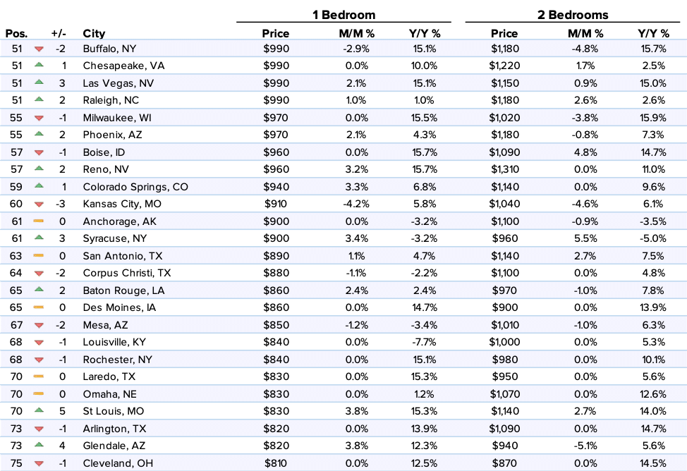 | 51 | Buffalo, NY | $990 | -2.90% | 15.10% | $1,180 | -4.80% | 15.70% |