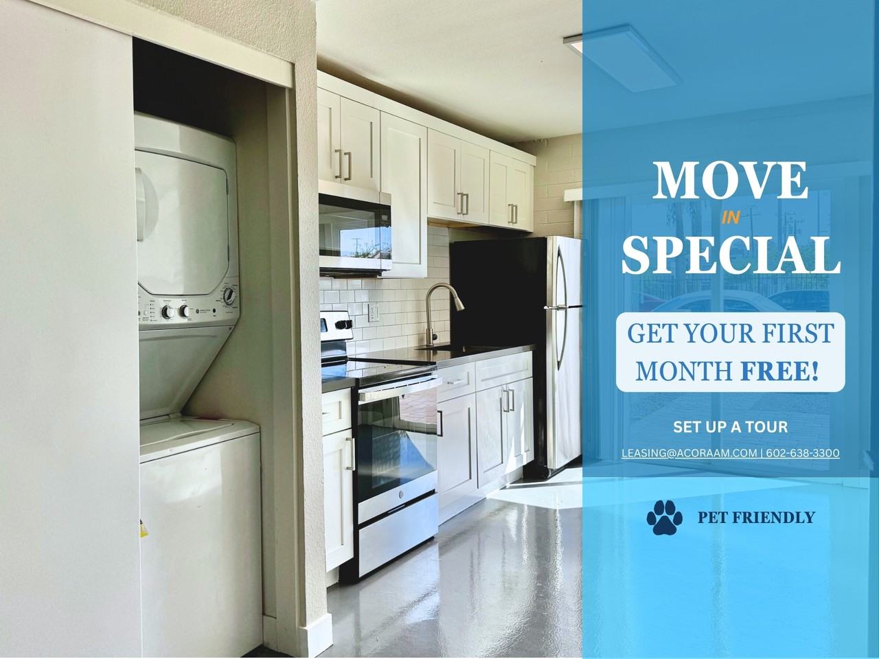 Coming Available March 27th, 2026! MOVE IN SPECIAL! 1ST MONTH FREE WHEN SIGNING A 13 OR 18 MONTH LEASE! DOWNTOWN LIVING AT THE VUE! Remodeled One Bedroom Apartment with Large Private Back Patio/ Yard and In-Unit Washer & Dryer – Close to Everything Phoenix Has to Offer! PLEASE ONLY INQUIRE IF YOU MEET THE FOLLOWING REQUIREMENTS: -No smokers -No crimes against children -No evictions or bankruptcies within the last 60 months -Household income must be at least 3x the monthly rent (proof of income required) -Full credit and criminal background checks are conducted by Acora Asset Management LLC in compliance with all Fair Housing Laws Take A Virtual Tour : https my matterport com show ?m=Tm6APqRHYft *Photos and Virtual Tour are of Similar Unit! * PRIME LOCATION -Minutes to the Roosevelt District -Near The Arrogant Butcher, The Vig, Taco Chelo, Pizzeria Bianco, Harumi Sushi -Close to shopping, nightlife, cultural attractions -Near ASU Downtown, Light Rail, Banner Medical Center & Sky Harbor APARTMENT FEATURES -Huge back patio/ yard space -Modern kitchen with quartz countertops -Epoxy concrete flooring throughout -Upgraded appliances & modern light fixtures -Ceiling fan -In-unit washer & dryer PET POLICY -Pet-friendly community -$25/month -One-time $150 pet fee -Pet charges are flat, not per animal -Limit is up to 3 pets UTILITIES -Utility Reimbursement: $225/month (Electricity, Water, Sewer & Trash) TERMS & PRICING -Rent: $1,195/month -Security Deposit: $800 (on approved credit) -Application Fee: $65 per applicant -Resident Services Charge: 2% of monthly rent -Renter’s insurance required -Lease Terms: 12, 13, or 18 months For more information, call us at 602-638-3300 or apply online at www AcoraAM com Offered exclusively by Acora Asset Management LLC Designated Broker: Colin Ralls NOW ACCEPTING APPLICATIONS!