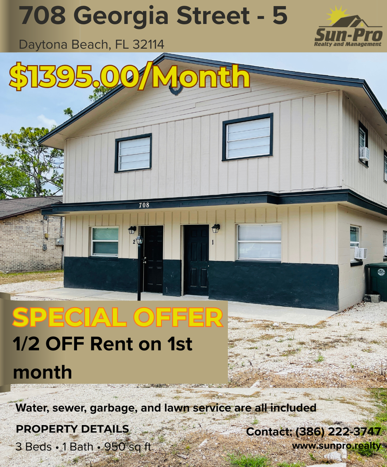 3-bedroom apartments at 708 Georgia St #5 cost about 35% less than the average rent price for 3-bedroom apartments in Daytona Beach.