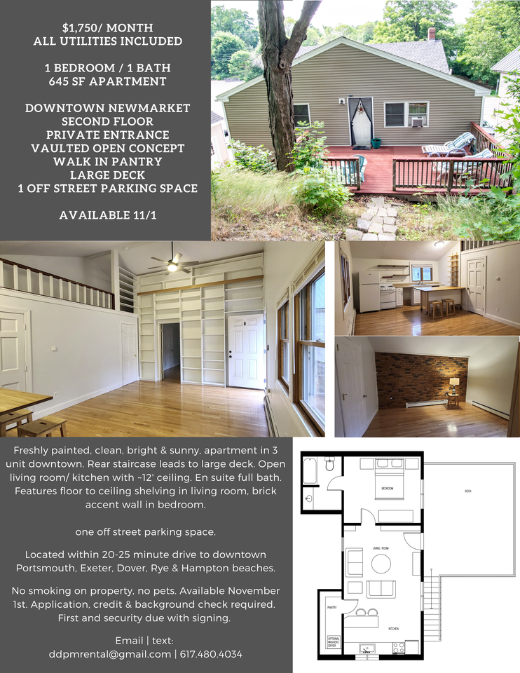 $1,750/ MONTH, ALL UTILITIES INCLUDED 1 Bedroom / 1 Bath 645 SF Apartment DOWNTOWN NEWMARKET SECOND FLOOR PRIVATE ENTRANCE VAULTED OPEN CONCEPT WALK IN PANTRY LARGE DECK 1 OFF STREET PARKING SPACE AVAILABLE 11/1 Freshly painted, clean, bright & sunny, apartment in 3 unit downtown. Rear staircase leads to large deck. Open living room/ kitchen with ~12' ceiling. En suite full bath. Features floor to ceiling shelving in living room, brick accent wall in bedroom. one off street parking space. Located within 20-25 minute drive to downtown Portsmouth, Exeter, Dover, Rye & Hampton beaches. Downtown location puts restaurants and shops all within walking distance, yet unit feels private, with large outdoor space. No smoking on property, no pets. Available November 1st. Application, credit & background check required. First and security due with signing.