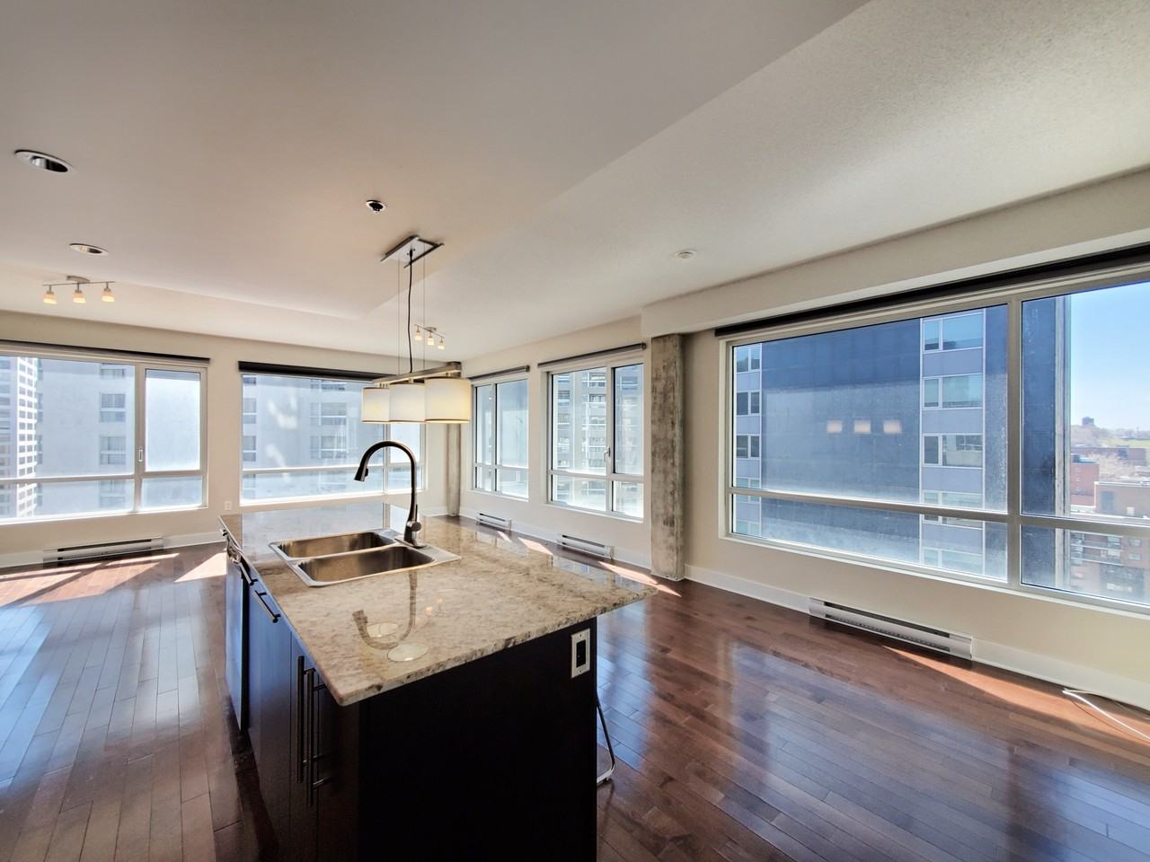 Beautiful corner unit with half its walls as windows. Extremely bright, W-SW exposure, large separate bedroom and open plan living area. Hardwood floors and cheat en-suite bathroom. The unit has its own washer dryer and a separate bathtub and show. The building Le Concorde has 24/7 doorman/concierge and a gym. It has only 120 units and only 6 per floor which makes it very exclusive. It is possible to rent a parking space in the building for an additional $200 per month. Located right in the heart of Downtown Montreal near McGill, the Place des Arts, St Catherines street and the underground city, several pharmacies and grocery stores within 5 minutes walk or less.