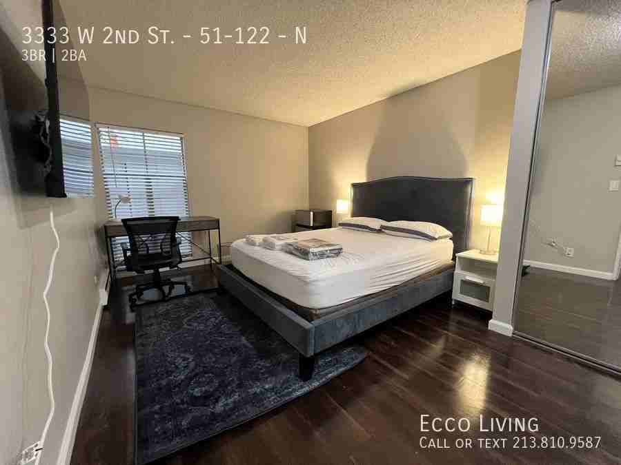 We are currently offering a private luxury suite for rent now in this amazing Korea Town location. The unit is a 1,000 sq. ft. 3 bedroom, 2 bathroom apartment located in the highly sought-after The Chadwick apartment homes. Your luxury suite includes a private en suite while the rest of the apartment will be shared with two others in their own shared bedroom and ensuite. The Chadwick apartments are a short walking distance to countless other restaurants, grocery stores, malls, banks, and bars. This centrally located apartment is near major public transportation routes like the Metro Red Line station, so you can skip the traffic to easily get to Hollywood. Or, head to Santa Monica with the Expo Line. Perfect for students and young professionals interning or working in downtown. Our convenient location in Rampart Village seals the dealwe ensure proximity to a wealth of exquisite landmarks, gourmet restaurants, historic sites, and entertainment venues that will keep you hooked on the city's electric nightlife. This private suite in these luxury apartments is an opportunity you do not want to miss. Experience living in an unbeatable location along with access to newly remodeled amenities in the building, including two 24-hour fitness centers, pools, jacuzzi's and more The apartment comes fully furnished, so just bring your clothes and personal items. Everything else will be provided for you. The kitchen is fully equipped with all of the necessities, including appliances and tableware. Your bedroom also comes ready for your arrival, with a brand new bed sheet set, comforter, and towel set upon move-in. All utilities, high-speed internet, and streaming services (Netflix, Hulu, and Disney+) are included in the price. Washers and dryers are also available in the unit for shared use. The monthly rent changes dynamically based on demand, occupancy, and market rent. Your rent always includes a fully furnished luxury bedroom with all utilities. No additional payment is required. Inquire today with our leasing team to find out the best offers and daily pricing! Bbq Disney+ Electricity Entertainment Room Gym Hulu Jacuzzi Mini Soccer Netflix Pet Park Play Ground Pool Pool Table Sewage Table Tennis Trash Water Wifi/Internet Workspace Room