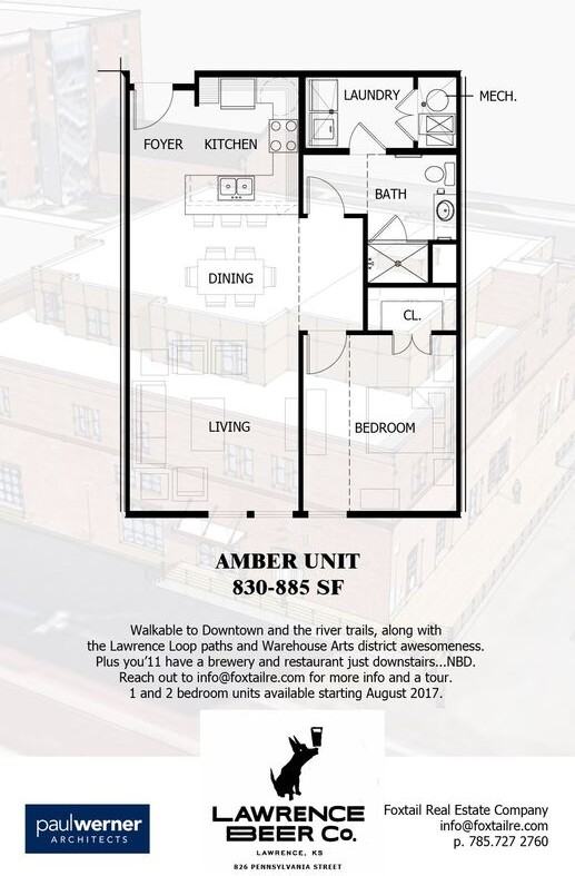 Be a part of Lawrence's newest and most vibrant arts district, the Warehouse Arts District! The historic Lawrence Seed Company Building is home to the buzzworthy Lawrence Beer Company on the main level, and 14 loft-style apartments on the second and third story. The Lawrence Beer Company Lofts are stunning one and two-bedroom units with beautiful updates and energy efficient appliances that are nestled into the heart of the Lawrence Warehouse Arts district. You are a short walk to downtown and have easy access to parks, coffee shops, and much more! This 1-bedroom/1-bathroom loft offers 830-885 sqft! Check out the list of awesome features it offers below: - washer/dryer in unit - concrete or vinyl plank flooring - new appliances and finishes - off street parking - 9ft ceilings - 3rd floor terrace - all electric appliances - dog friendly property You only pay electric and wifi—act on this sweet deal quick!