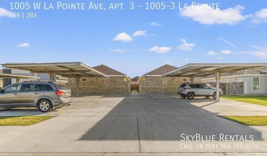 Ready to MOVE IN! WATER AND TRASH INCLUDED! Apply NOW or schedule a showing here ---> https tinyurl com 1005-3LaPointe Beautiful unit, wood like ceramic flooring, modern sleek cabinets, Granite Countertops, Ceiling Fan in Livingroom and Bedrooms. Master bedroom separate from the other bedrooms, with a gorgeous bathroom suite, walk-in closet, shelves. Remote controlled ceiling fan and light fixture, two assigned carport parking spaces. Appliances & Features: WATER AND TRASH INCLUDED Stainless Steel Kitchen Appliances. - Refrigerator, Stove, Microware. Full-Size Washer and Dyer Carport for 2 vehicles Lawn Maintenance IS included. Lease Term: 12 mo. Lease. Apply Now or call/text (956)436-5193 to schedule a showing Year Built: 2022 Rental Assistance: No Fifty-five plus: No Multiplex: No