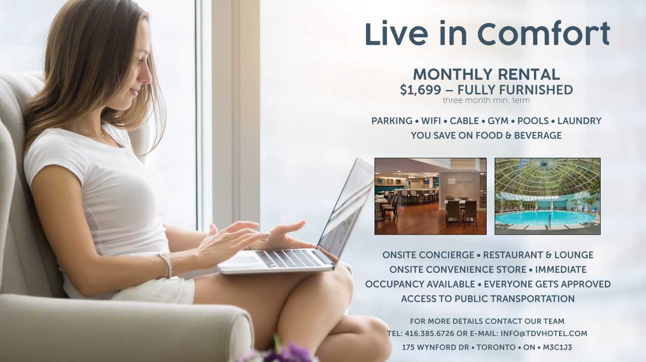 Located in mid-town Toronto, accessible to major highways, near the Don Valley Parkway and Eglinton Ave East. Parking WiFi Cable Gym Indoor Swimming Pool Seasonal Outdoor Swimming Pool Laundry Facility ($) Fridge Microwave Weekly Housekeeping Service Meal Package Add On; Available At Surcharge ($) $1,699.00 Per Month For More Details And/Or To Make Arrangement, Contact Our Team: Tel: 416-385-6726 Email: ****