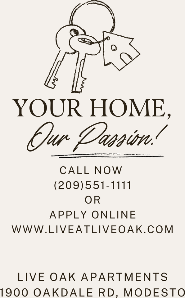 1 Bedroom/ 1 Bathroom, Downstairs (Custom Style) Stainless Appliances! Inside Laundry Connections Lease it now before it's gone! In Person Tours Available Today! Contact us today Applications available online at www liveatliveoak com Live Oak Apartments 1900 Oakdale Rd Modesto, CA 95355 Amenity list: ✦Downstairs, 1 Bedroom 1 Bath ✦Stainless Steel Appliances ✦Dual Pane Windows ✦Open Concept Floor Plan ✦Pool and Spa ✦Assigned Covered Carport ✦24-Hour Emergency Maintenance ✦24/7 Card-Operated Clothes-Care Centers ✦Pet friendly *breed restrictions apply* ✦Short Term Leases *with an upcharge* ✦Furnished Available *monthly up charge* ✦Conveniently located near Shopping Centers, Hospitals, HWY 99, & Restaurants! ✦$700 Deposit on approved credit ✦Life-sized Chess and Checkers ✦Community Garden ✦Accepts Credit Card Payments ✦Applications online at www liveatliveoak com Rental Qualifications: Credit History: All accounts are in good current standing. Credit score will determine the deposit. Rental History: At least 6 months of favorable rental history or home ownership. Friends or family are not valid rental history. Late payments, NSF, lease violations or evictions may result in denial. Less than 70% of on-time payments may result in denial. First-time renter program available with a 6-month initial lease term when all other requirements are met. Income: At least 6 months of consistent verifiable income. Gross monthly income must be 2.5 times the monthly rent. Examples: 30 days of most recent pay stubs from employer, new job offer letter-signed and dated, benefits award letter-dated within the last 60 days, Self-employed- must provide 2 most recent years of signed tax returns with Schedule C. Call or stop by today! Live Oak Apartments 1900 Oakdale Road Modesto, CA 95355 VIP Apartment Management, Inc. Corporate License: 02130378