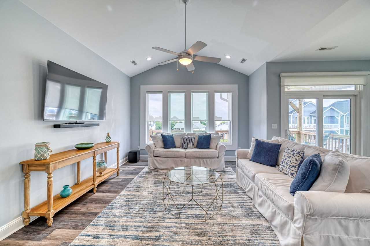 PERFECT BEACH WINTER GETAWAY The Van Morrison song “Into the Mystic” says, “Smell the sea and feel the sky, Let your soul and spirit fly, Into the Mystic”. Isn’t that the feeling we all want? Timeless and free. That is what you will find at this beautiful beach home. Walking in, you’ll climb the stairs to the first floor, where you’ll find 3 of the 4 bedrooms. The master suite has a king-size bed, a smart TV, and an ensuite bathroom with a step-in shower with a dual-head shower. The other 2 bedrooms share the hall bathroom with a step-in shower. The stacked washer & dryer are found on this floor. Each bedroom has sliding glass doors that access a deck. The top floor is where all the family gathering is done. The living room is comfortable, light, and airy with plentiful windows. The dining room table seats 4 and is perfect for meals, a card game, or working on a puzzle. The large and well-appointed kitchen has a generous island for meal prep or the meal itself. The island seats another 4. For convenience, there is a half bath. The bedroom on this floor has a queen-sized bed, a smart TV, and an ensuite bathroom with a bathtub/shower. The great room and the bedroom both access a deck. The whole interior is decorated with a cool and sleek palette of blues to make you feel like you're still in the beautiful presence of the ocean, even when inside. No matter where you are in the house, relaxation and calm are around every corner. Whether enjoying a fresh mug of coffee on the furnished patio or having drinks with friends in the various homey living areas, you will never feel out of place in this beautifully intricate home away from home. The exterior is almost as good as the interior, with a hot and cold running enclosed outside shower and outside dining set. Located a quick walk or bike ride from the beach. Your days will be spent collecting shells and sharks’ teeth on the beach, and your evenings enjoying a glass of wine with your group while listening to waves crash on the beach. **Contact Ann at Sea Coast Rentals at 910.2541.3641 for further information on our off-season furnished rentals and/or to check available dates. Check out all our rentals: both off-season/furnished and long-term at Rentals SeaCoastRentals com