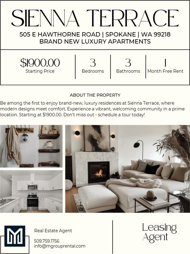 Be among the first to enjoy brand-new, luxury residences at Sienna Terrace, where modern design meets comfort. Experience a vibrant, welcoming community in a prime location near shopping, hiking trails, and peaceful surroundings. Quality Finishes Residence Features o One, two, three-bedroom residences ranging from 793 square feet to 1275 square feet o Keyless Entry o Signature interiors with designer finishes, high-end appliances o GE Stainless Steel Appliances o Natural Quartz Stone Countertops o Real Wood (White) Shaker Cabinets o GE Full-Size Front-Loading Washer & Dryer o Wood Vinyl Plank Style Flooring o Soaring 9' Ceilings o High-Efficiency Split System (Air & Heat) o Many third-floor residences offer vaulted ceilings and include transom windows for increased natural light o Expansive views of the Mount Spokane Mountains o Ground floor residences feature full walk-out patios The Great Outdoors Mount Spokane State Park There are several parks surrounding Sienna Terrace. However, Mount Spokane State Park is located minutes from the apartments. This large park features hiking, mountain biking, skiing, snowshoeing, camping and historic vista house. Enjoy a friendly picnic or bring a frisbee or ball and play outside. Nature Awaits Storage As any outdoor enthusiast knows, wilderness adventures require a lot of gear. While all residences feature large closets, Sienna Terrace also offers additional storage opportunities that are perfect for skis, fly rods, golf clubs, climbing and backpacking equipment, and all of that other FuN stuff you have on hand for making the most of Spokane area recreation. Don't miss your chance to experience elevated living - schedule your private tour today and secure your new home at Sienna Terrace before it's gone. With limited availability, now is the time to explore a tour and envision the lifestyle that awaits you. Move-In Details & Lease Terms * Lease Terms: 9 to 18 months * Move-In Special: Free Rent (Call for details) * Call Today 509.759.1756