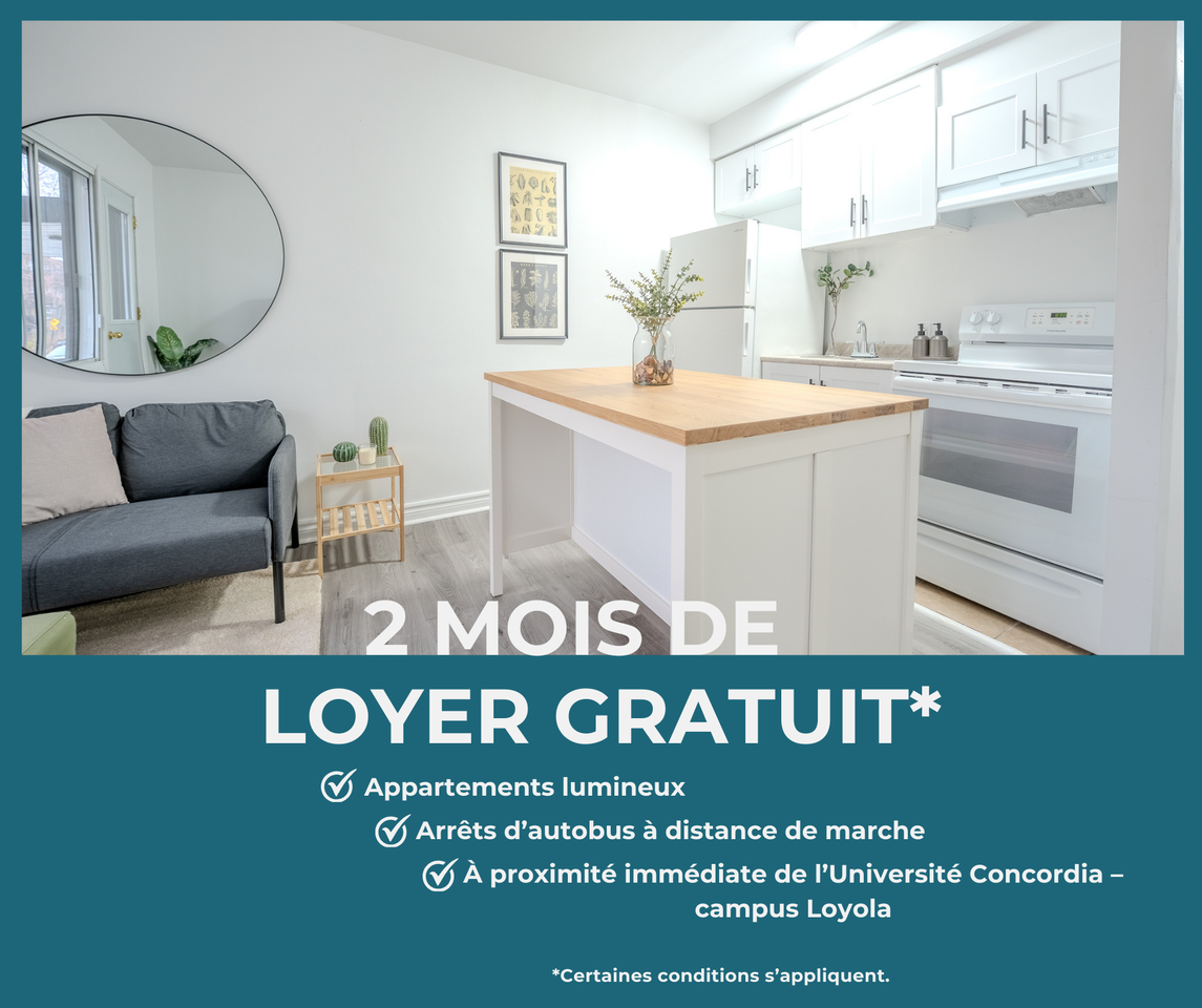 🏡 Découvrez votre nouveau chez-vous au 2300 Avenue Madison à Montréal Situé dans un quartier calme et pratique, l’immeuble 2300 Madison vous offre des appartements lumineux et bien aménagés, conçus pour répondre aux besoins des étudiants, jeunes professionnels et familles. 📍 2300 Avenue Madison, Montréal 🎉 OFFRE À DURÉE LIMITÉE : 2 MOIS DE LOYER GRATUIT* Appartements 1 et 2 chambres disponibles 💡 Caractéristiques des logements : ✔️ Thermopompe incluse (chauffage et climatisation) ✔️ Électroménagers inclus ✔️ Appartements lumineux et fonctionnels ✔️ Possibilité d’unités meublées ✔️ Petits animaux acceptés 📍 Emplacement idéal : 🚌 Arrêts d’autobus à distance de marche 🎓 À proximité immédiate de l’Université Concordia – campus Loyola 🌳 Quartier résidentiel calme et bien desservi Planifiez votre visite dès maintenant — ne manquez pas cette opportunité ! 📞 (438) 600-9890 * Certaines conditions s’appliquent. ENGLISH 🏡 Discover your new home at 2300 Madison Avenue in Montréal Located in a quiet and convenient neighborhood, 2300 Madison offers bright and well-designed apartments, ideal for students, young professionals, and families. 📍 2300 Madison Avenue, Montréal 🎉 LIMITED-TIME OFFER: 2 MONTHS OF FREE RENT* 1- and 2-bedroom apartments available 💡 Apartment features: ✔️ Heat pump included (heating & air conditioning) ✔️ Appliances included ✔️ Bright and functional layouts ✔️ Furnished units available ✔️ Small pets welcome 📍 Ideal location: 🚌 Bus stops within walking distance 🎓 Close to Concordia University – Loyola Campus 🌳 Quiet and well-connected residential neighborhood 📞 To schedule a visit: (438) 600-9890 * Certain conditions apply.