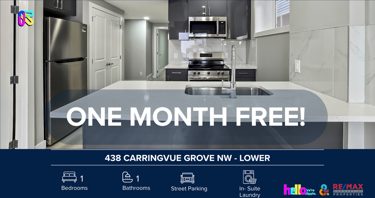 AMAZING BRAND NEW 1 BEDS, 1 BATHS LOWER/BASEMENT LEVEL | NO PETS ALLOWED | ONE MONTH FREE IF MOVE IN BY Feb 1/2026 Welcome to your next home! This beautifully maintained 438 Carringvue Grove NW- Lower offers the perfect blend of comfort, style, and convenience. INCENTIVE: ONE MONTH FREE Situated in the community of Carrington, This master-planned community features over 65 acres of protected environmental reserves, natural wetlands, and serene ponds that offer scenic vistas and winding walking paths, this unit is ideal for anyone looking for a clean, modern, move-in ready space. SHOWINGS: Open-house format — book today! https showmojo com l 528c1a40ce Prices, availability, and promotions subject to change without notice. Features: - Furnished or Unfurnished: Unfurnished - Pets: No Pets Allowed - Smoking: Non-Smoking - Parking: Street Parking - Storage Included: No - Laundry: In- Suite Laundry - Management Type: Full Management - Lease Term: Long Term Split Utilities Information: - Utilities Included: No Utilities Included - Shared Utility Unit: Utilities split between 2 units: 60% Main (Upper), 40% Secondary (Lower) - Deposit: $350 for Main, $225 for Secondary (first 3 months of tenancy). Why You'll Love It: - Brand New Modern Living: A legal lower-level suite designed with a contemporary open-concept layout that maximizes space and natural light. - Gourmet Kitchen: Features high-end finishes, quartz countertops, and a full suite of stainless steel appliances including a dishwasher, microwave, and hood range. - Private Master Suite: Includes a spacious bedroom with large windows and a dedicated full bathroom. - Advanced Climate Control: Features a modern thermostat system and high-efficiency mechanical components to ensure year-round comfort. ? Location Perks: - Active Lifestyle Basecamp: Located in the master-planned community of Carrington, offering direct access to 65 acres of green space, ponds, and the 138 km Rotary/Mattamy Greenway trail system. - Walkable Convenience: Steps away from the Shops at Carrington Green, featuring NoFrills, a pharmacy, dental services, and popular dining like barBurrito and Love at First Scoop. - Prime Transit Connectivity: Perfectly positioned for commuters with immediate access to Stoney Trail, Centre Street, and future Green Line LRT expansion plans. - Family-Centric Amenities: Nearby playgrounds, a half-basketball court in Greenway Park, and proximity to multiple reputable schools. - Swift Travel Connections: Only a 10-minute drive to the Calgary International Airport and major shopping hubs like CrossIron Mills and Beacon Hill. ONE MONTH FREE offer: A special savings equal to one month's rent (maximum), spread evenly across your 12 month lease. For leases with initial term less than 12 months, the incentive will be prorated accordingly. Book your viewing today — this one won't last.