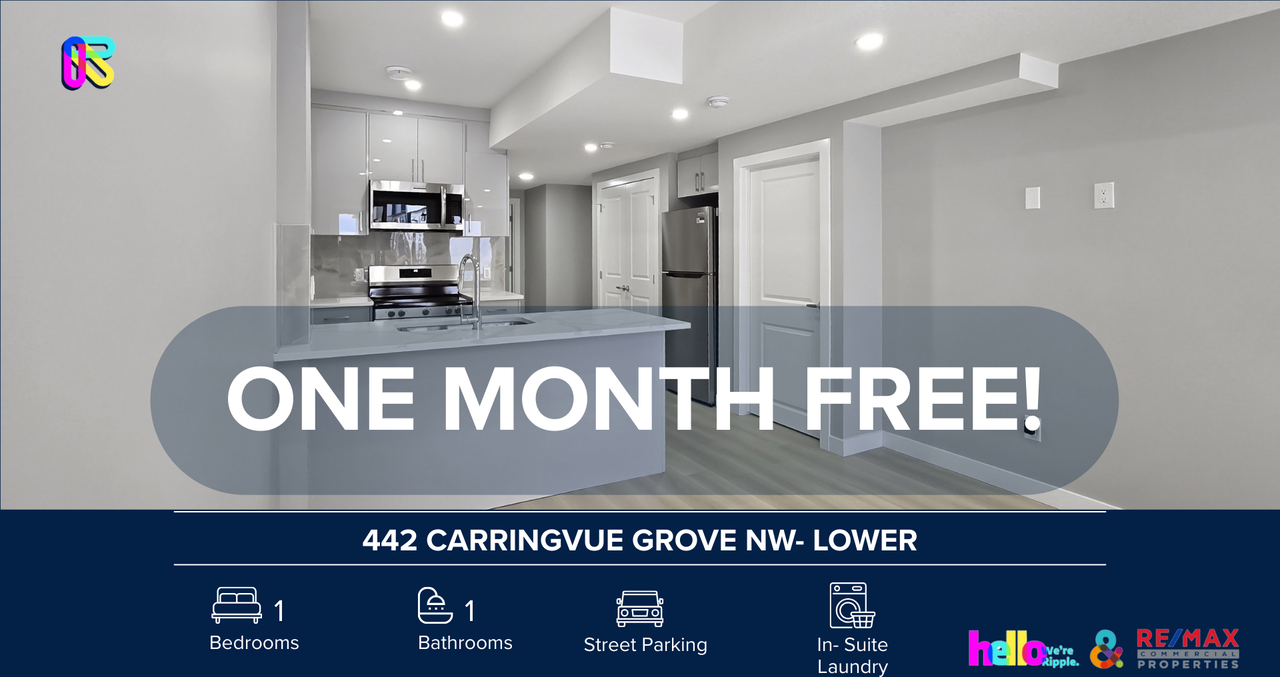 AMAZING BRAND NEW 1 BEDS, 1 BATHS LOWER/BASEMENT LEVEL | NO PETS ALLOWED | ONE MONTH FREE IF MOVE IN BY Feb 1/2026 Welcome to your next home! This beautifully maintained 442 Carringvue Grove NW- Lower offers the perfect blend of comfort, style, and convenience. INCENTIVE: ONE MONTH FREE Situated in the community of Carrington, This master-planned community features over 65 acres of protected environmental reserves, natural wetlands, and serene ponds that offer scenic vistas and winding walking paths, this unit is ideal for anyone looking for a clean, modern, move-in ready space. SHOWINGS: Open-house format — book today! https showmojo com l 528c1a40ce Prices, availability, and promotions subject to change without notice. Features: - Furnished or Unfurnished: Unfurnished - Pets: No Pets Allowed - Smoking: Non-Smoking - Parking: Street Parking - Storage Included: No - Laundry: In- Suite Laundry - Management Type: Full Management - Lease Term: Long Term Split Utilities Information: - Utilities Included: No Utilities Included - Shared Utility Unit: Utilities split between 2 units: 60% Main (Upper), 40% Secondary (Lower) - Deposit: $350 for Main, $225 for Secondary (first 3 months of tenancy). Why You'll Love It: - Brand New Modern Living: A legal lower-level suite designed with a contemporary open-concept layout that maximizes space and natural light. - Gourmet Kitchen: Features high-end finishes, quartz countertops, and a full suite of stainless steel appliances including a dishwasher, microwave, and hood range. - Private Master Suite: Includes a spacious bedroom with large windows and a dedicated full bathroom. - Advanced Climate Control: Features a modern thermostat system and high-efficiency mechanical components to ensure year-round comfort. Location Perks: - Active Lifestyle Basecamp: Located in the master-planned community of Carrington, offering direct access to 65 acres of green space, ponds, and the 138 km Rotary/Mattamy Greenway trail system. - Walkable Convenience: Steps away from the Shops at Carrington Green, featuring NoFrills, a pharmacy, dental services, and popular dining like barBurrito and Love at First Scoop. - Prime Transit Connectivity: Perfectly positioned for commuters with immediate access to Stoney Trail, Centre Street, and future Green Line LRT expansion plans. - Family-Centric Amenities: Nearby playgrounds, a half-basketball court in Greenway Park, and proximity to multiple reputable schools. - Swift Travel Connections: Only a 10-minute drive to the Calgary International Airport and major shopping hubs like CrossIron Mills and Beacon Hill. ONE MONTH FREE offer: A special savings equal to one month's rent (maximum), spread evenly across your 12 month lease. For leases with initial term less than 12 months, the incentive will be prorated accordingly. Book your viewing today — this one won't last.