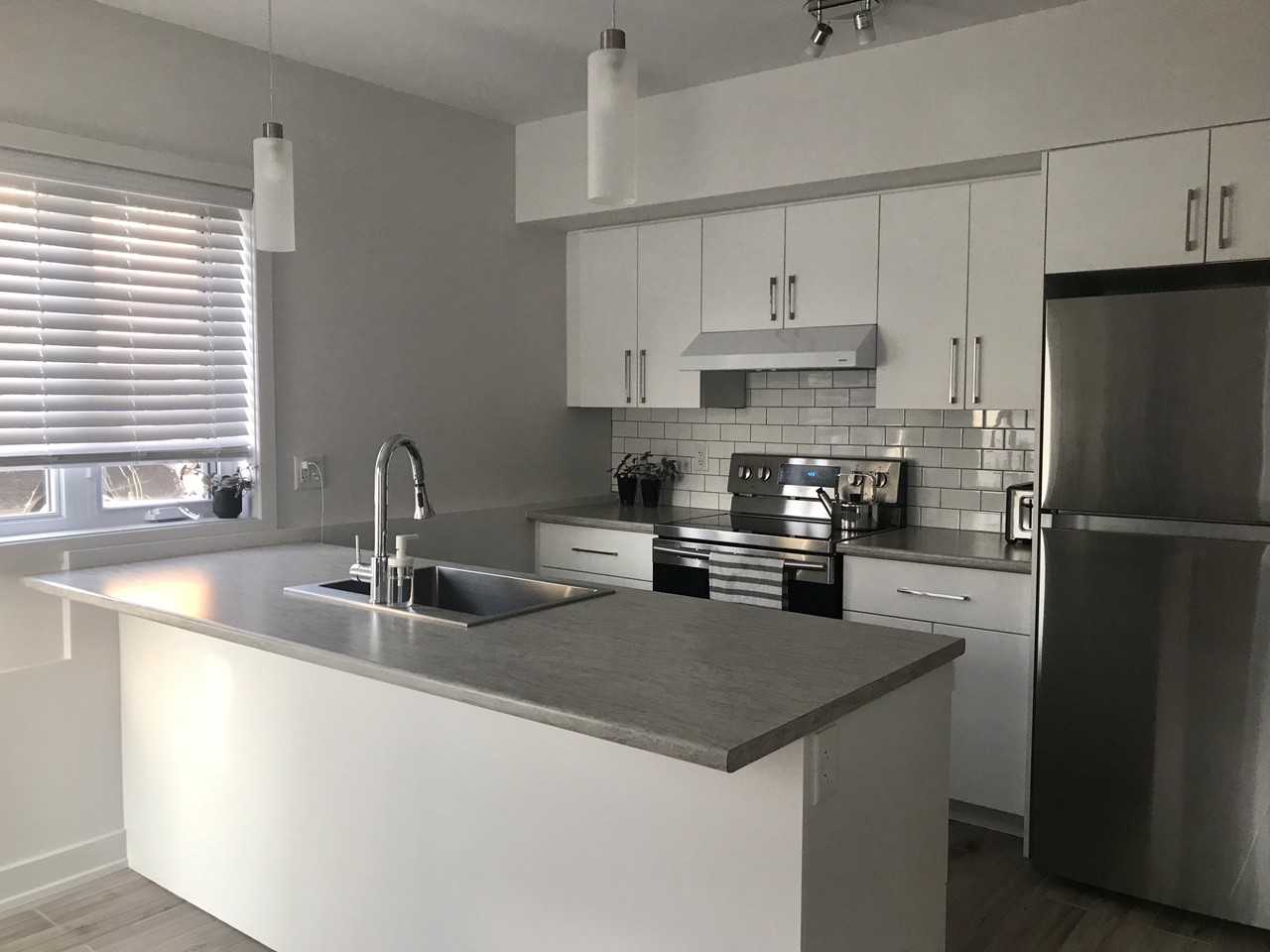 Beautiful new build (2020) available immediately! Move in October 1 or sooner. Clean and perfect! -Tons of windows and lighting in every room (dimmers). -Bright even on cloudy days, beautiful orange light fills the apartment in afternoon/evening. -Privacy shields on windows in entrance and washroom, blinds in kitchen, rods in living room/bedroom. -All new efficient appliances: washer & dryer in washroom, dishwasher, fridge, stove and huge sink in kitchen. -Heated ceramic floors (looks like wood) and air conditioner (remarkably quiet and really quick). -Air exchange. -Beautiful landscaping. -Bike storage at the back. -Sliding door into bedroom. -Compact build with space planned very efficiently and plenty of storage. -Tons of counter space for seating. Neighbours are friendly young professionals and very quiet. Located in front of restaurant Le Cellier, clientèle quiet too. Landlords are friendly and helpful - always responsive. Really well-located; close to Ottawa and Gatineau, lots of walks and bike, parks, cultural events always happening nearby. Close to transit. Close to all amenities. Non-smoking. No pets. 1 year lease. Internet already set up - can be transferred. Hidden box inside closet, very neat. Hydro is extra but about $30 per month max. 40$ credit check for applicants and subject to landlord's approval. Happy to do visits, virtual or in person.