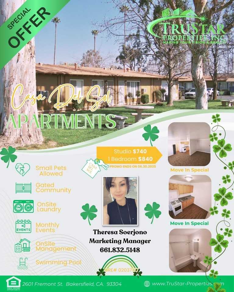 Casa Del Sol is located in Bakersfield, California in the 93304 zip code. This apartment community was built in 1965 and has 1 story with 205 units. The property is beautifully landscaped and features manicured grass areas, shade trees, trimmed shrubs / bushes, and colorful flower beds. Nestled in a quiet cul-de-sac, Casa del Sol apartment homes offers a gorgeous place to call home. Park settings greet you in this beautiful quiet gated complex. Generously sized studios & 1 bedrooms homes are available. We love our residents, and we know you will love it here, too! -STOVE IN UNIT -NEW CARPET INSTALL (SOME UNITS) -24 HR ONLINE PAYMENT -24HR MAINTANCE SERVICE CALLS -CELLING FANS -COMMUNITY POOL -LAUNDRY ON SITE -LEASING OFFICE ONSITE