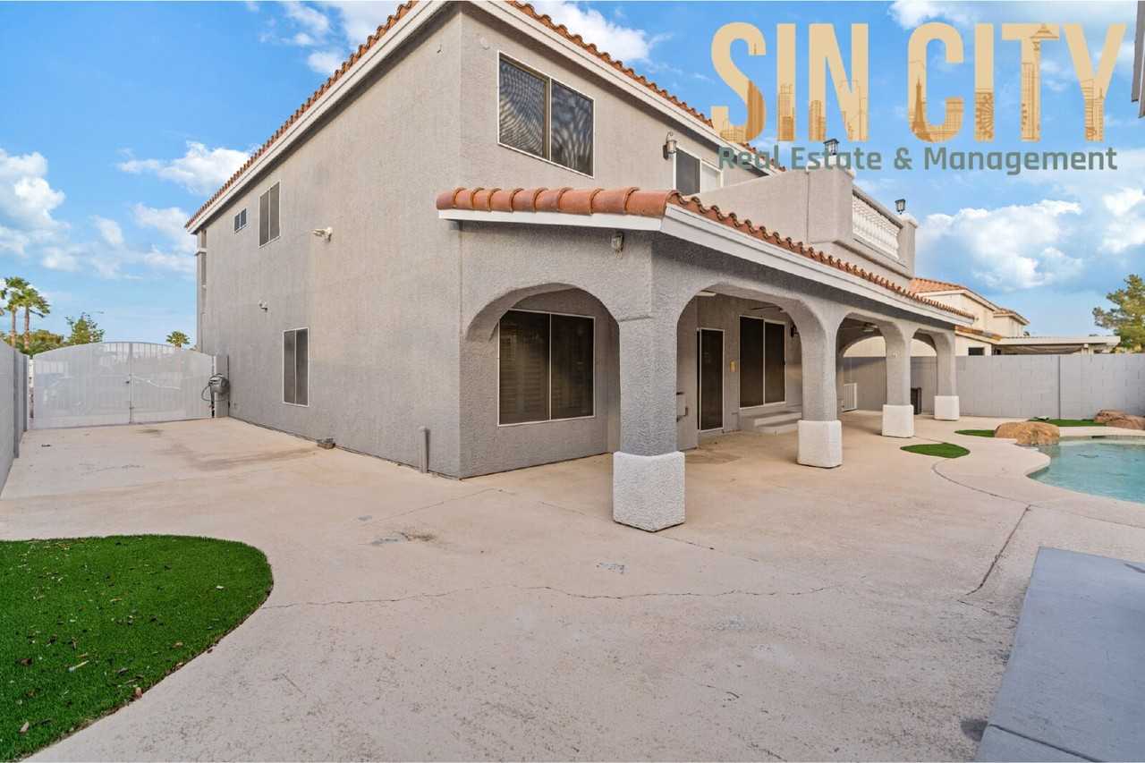 The owner spared no expense on upgrades in this truly stunning home. This majestic five-bedroom, three-bath residence offers resort-style living with a heated pool, mature palm trees, and exceptional curb appeal. The home features granite countertops, tile flooring throughout, and expansive living spaces including a formal living room, family room, and a large upstairs loft. An extra-large den provides the perfect setup for a movie or entertainment room. For added convenience, there is a downstairs bedroom and full bath, ideal for guests or multi-generational living. The property also boasts RV parking, double gate access with ample side parking, and state-of-the-art security equipment available for optional use. This home combines luxury, functionality, and space—perfect for both everyday living and entertaining. Sin City Real Estate and Management LLC B 1003001 LLC Move in fees: First Months Rent Security deposit $175 Lease prep fee