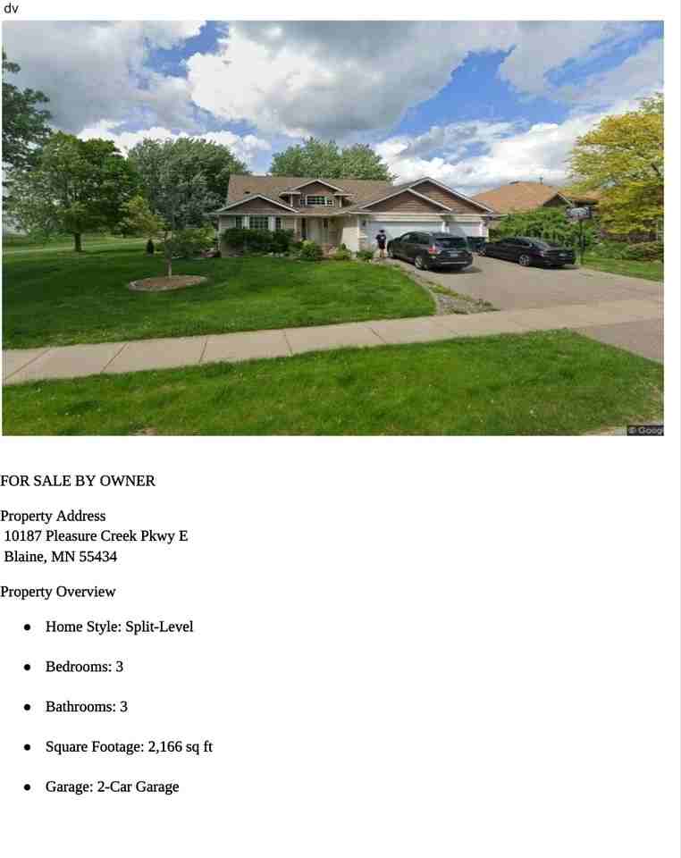 Property Id: 2439202 Property Address 10187 Pleasure Creek Pkwy E Blaine, MN 55434 Property Overview Home Style: Split-Level Bedrooms: 3 Bathrooms: 3 Square Footage: 2,166 sq ft Garage: 2-Car Garage Year Built: 2000 HOA: None Property Description This beautiful split-level home is located on a quiet corner lot in Blaine, Minnesota, offering both comfort and convenience. The home features 3 spacious bedrooms and 3 bathrooms, along with a 2-car garage and energy-efficient features. The fully finished basement provides additional living space and includes extra crawl space storage, perfect for keeping seasonal or long-term items organized. Step outside to enjoy the beautifully landscaped backyard, ideal for relaxing or entertaining guests. The property also features water access attached to the yard, making it perfect for fishing or canoeing. Conveniently located near top-rated schools, parks, and shopping, this home offers a peaceful setting while still being close to everyday amenities. Nearby schools include: Madison Elementary School (about 0.3-0.4 miles away) Northdale Middle School (about 1.6 miles away) Blaine Senior High School (about 3 miles away)