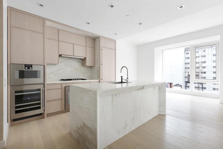 ZMP100699424 - Be the first one to live in this brand new and very impressive residence at The Centrale and enjoy the buildings state of the art amenities. Apartment 14 B is a large open concept - 1 bedroom 1.5 bathrooms unit offering northeastern views of the Manhattan skyline through floor-to-ceiling windows. White oak flooring throughout leads from the entry foyer into an open living and dining concept, complete with a chef\'s kitchen offering honed Capri marble countertops, backsplash, and a waterfall island with room for seating. The kitchen has a refined aesthetic with streamlined custom white oak millwork that seamlessly integrates a full Gaggenau appliance package, including a wine refrigerator, complemented by Dornbracht fixtures. The serene marble-clad master bathroom offers Bianco Dolomiti radiant heated flooring underfoot, Marno Illusion stone tiled walls, and a custom vanity with white oak, rift-cut wood veneer millwork, and Marno Illusion countertops, completed with a built-in medicine cabinet, a Kallista Sink and Dornbracht Fixtures. The handsome powder room features a dramatically veined Nero Maquina vanity countertop, ebony stained oak quarter cut wood veneer vanity and Nero Maquina floors. Beautiful Cobalt Flash marble wet wall, Dornbracht fixtures and a Kohler Corbelle toilet offers a striking contrast against the dark woods and stones. Two zones Nest Learning Thermostat and Bosch washer and dryer complete this elegant residence. The owner installed custom rolling blinds and blackout. The grand amenities spaces are personalized with handmade artwork, distinctive marbles, natural stones, and dramatic light fixtures that come together to create an ethereal, intimate feel. Residents arrive to The Centrale through a sheltered porte-cochere or the private residential lobby, which are both attended 24 hours a day. The formal Great Room, Private Dining Room with Catering Kitchen, the Club Room, and an all-season Club Terrace are perfect for entertaining in any style.A state-of-the-art fitness center overlooks a 75\' lap pool, while the yoga room offers a serene respite. At 71 stories, The Centrale takes its place alongside Midtown Manhattan\'s most iconic buildings. The Centrale\'s exterior design by Pelli Clarke Pelli Architects, builds upon classic Art Deco architecture with contemporary elements thoughtfully displayed throughout, including the lightly reflective glass facade articulated with facets of terracotta chevrons. The Centrale reveals its base, body and crown from street to the sky with crystalline switchbacks, creating a dynamic rhythm of angled reflections of the surrounding Midtown landscape. Centrally located, walking distance from the worlds most famous shopping, 5th Avenue and Madison Avenue, and the best dinning options in town. rental description