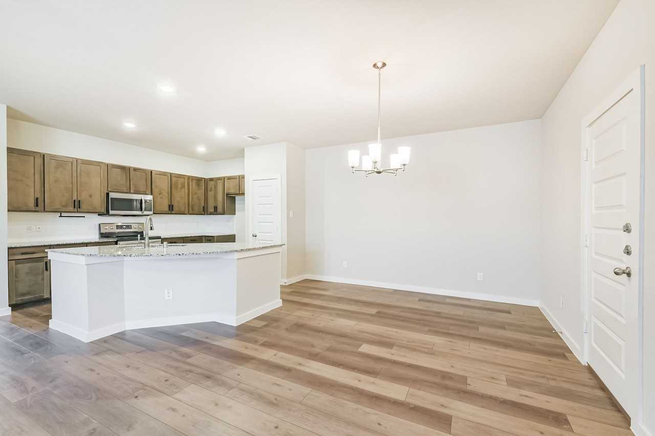 This beautiful home offers a popular open-concept layout and thoughtful upgrades throughout. The kitchen features granite countertops, a breakfast bar, stylish appliances, tile backsplash, and an island sink. You'll love the high ceilings, recessed lighting, ceiling fans, and luxury vinyl plank flooring. The primary suite includes double sinks, a walk-in shower, and a spacious closet. Enjoy the outdoors from the covered patio. The two-car garage comes with an opener and remotes, and the front and back sprinkler system makes lawn care easy. The front yard is maintained by the HOA. Conveniently located near shopping, dining, and entertainment. Professionally managed for peace of mind.