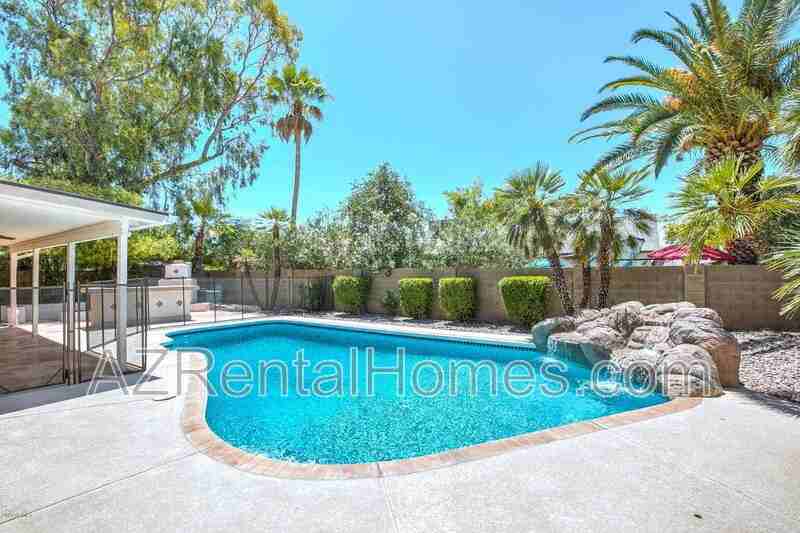 Huge Mesa 4/2.5 pool home with a 3 car garage! This property has received a ton of upgrades including dual pane windows, granite countertops, stainless steel appliances, flooring, tile surround shower, and more. Vaulted ceilings just inside the entry, separate living,/dining and family room. The kitchen has stainless steel appliances, granite, and a pantry. The resort style backyard includes a sparkling blue pool, waterfall water feature, covered patio, fireplace, and bar top. Truly unique bedroom sizes at this property. "Master" sized bedrooms for the 2nd and 3rd bedrooms with walk--in closets. The actual master suite has it's own balcony accessed only from the bedroom. Pool service is included with rent!