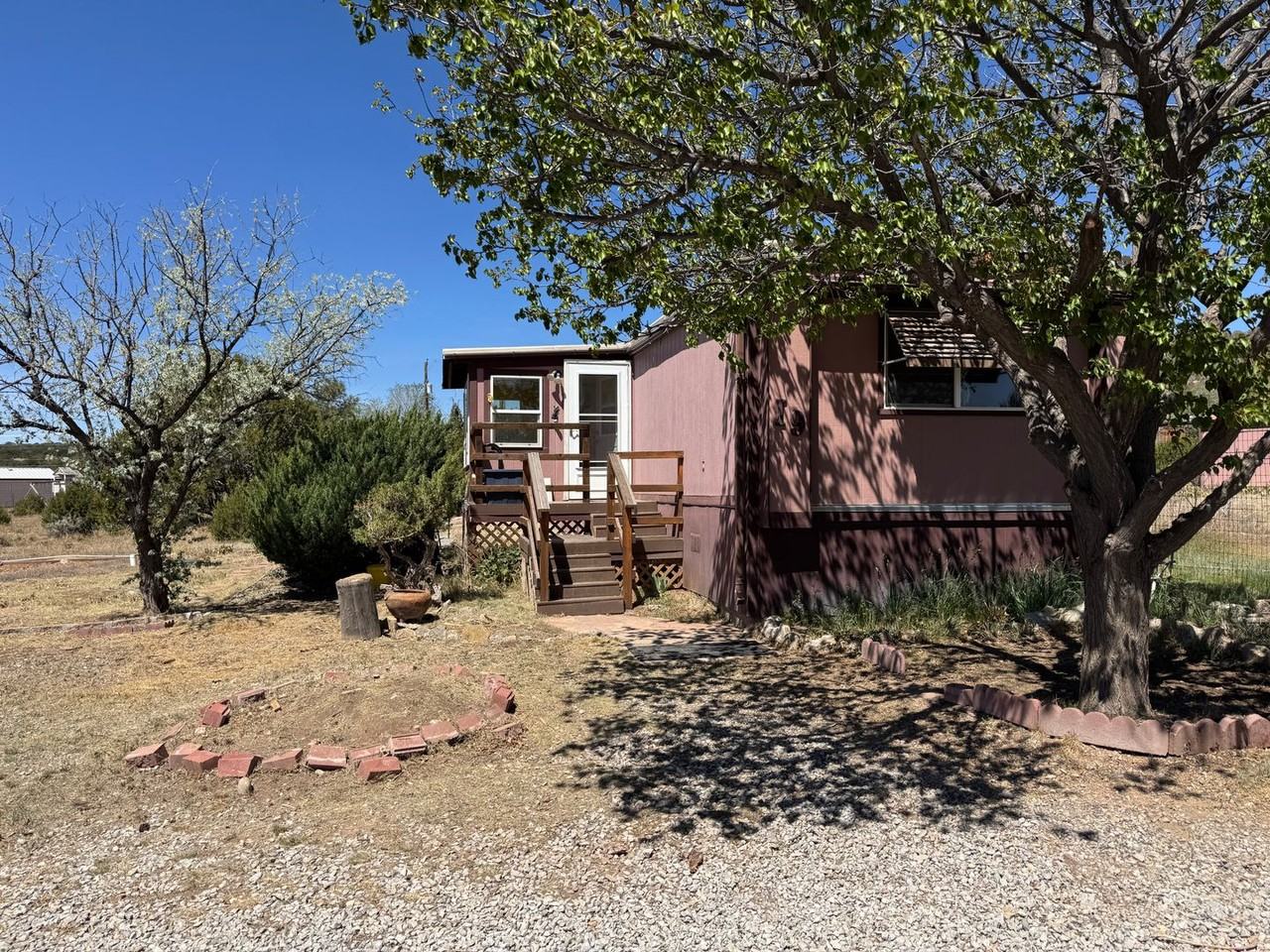 This 3 bedroom, 2 bathroom manufactured home opens to cozy living room with wood burning stove. 2 nice sized bedrooms and bathroom on one side and primary bedroom and bath on opposite end. Laundry area with washer & dryer. Sunroom, lush landscaping, fenced back yard, lots of trees, & shed. New flooring. Call Lee for more information or to schedule a showing, 505-730-5232.
