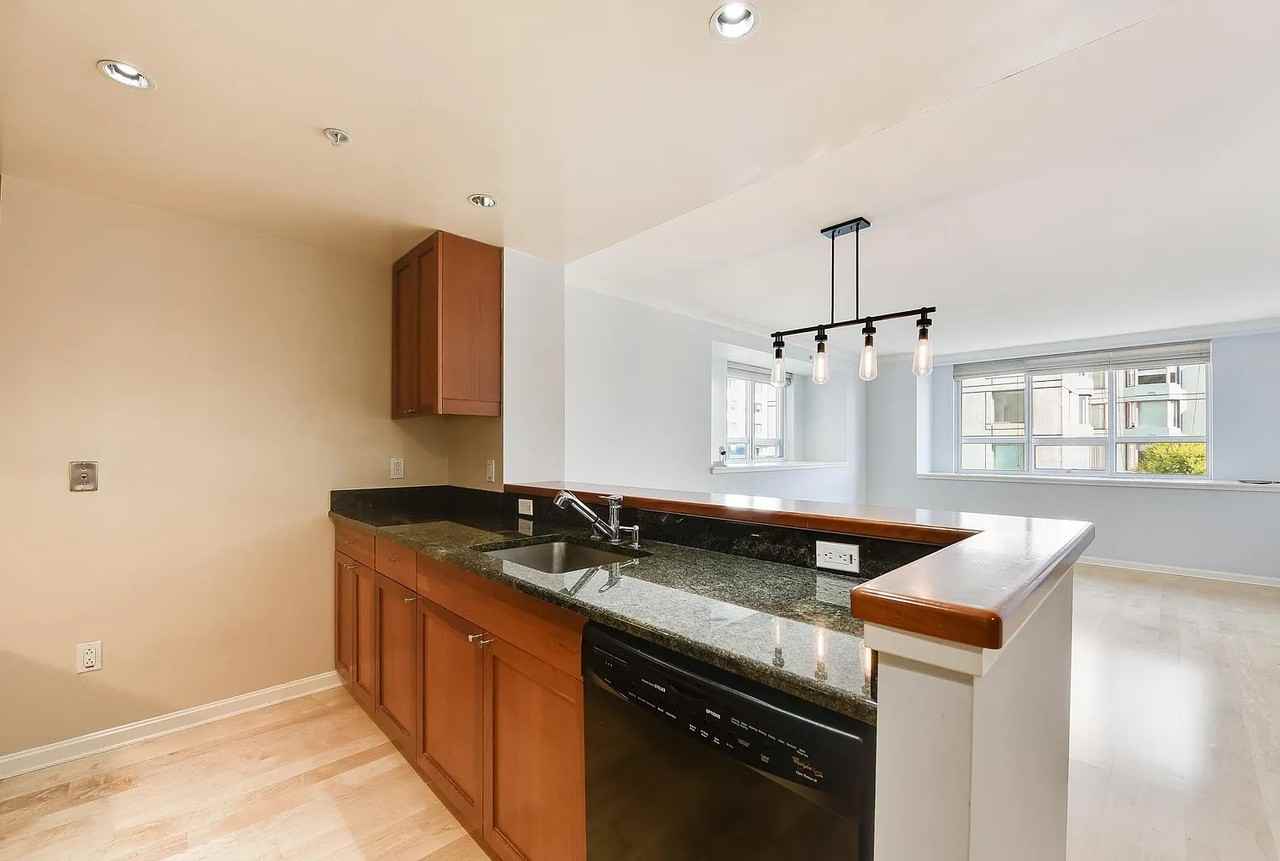 Welcome home to unit 705. This large one-bedroom plus den layout is superbly practical: there is space for your good-sized dining table beside the open kitchen, with plenty of room for a large sofa and coffee table that directly face the full and uninterrupted "TV wall". The well-appointed kitchen has granite counters, a gas range with an external vent, stainless steel appliances and abundant cabinets. A private and separate alcove is situated across from the kitchen, for use as your home office or whatever you desire. The spacious bedroom has a generous size closet, plush carpet and a private view balcony. The full bathroom hosts a convenient shower-over-tub, and an extra wide vanity with plenty of storage space on the counter top and in the drawers below. Other features include a coat closet, in-unit laundry, and deep window boxes that would make great shelving space, or a popular spot for you to bask in the sun! 1 car parking is available