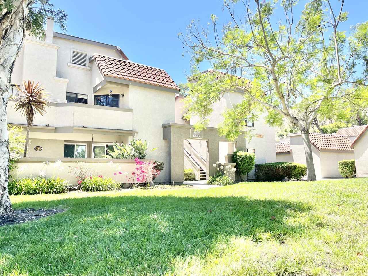 TOP FLOOR CONDO WITH VIEWS IN VILLA MIRA. Light and bright, freshly painted crisp white, this condo is one not to miss. Boasting 3 beds and 2 baths (the largest floorplan in the tract) this property has a large living room with high ceilings and direct access to the patio for the ultimate in indoor outdoor living with incredible views. Laminate flooring with upgraded baseboards. The kitchen features freshly painted white cabinetry, tile counters, a pantry, and an eat-at counter plus new Vinyl flooring. The master bedroom has direct access to the patio and an en suite with a step-in shower newly glazed plus brand new shower door. An additional patio adjacent to the kitchen offers even more outdoor space plus a laundry closet that fits a full-size washer and dryer. The secondary bathroom has a brand new vanity, faucet, mirror and light fixture. Two additional bedrooms with good storage/ closet space complete this super cute condo! The 1 car detached garage makes parking a breeze and provides additional storage space plus two extra parking spaces which was paid by the owner. Villa Mira offers its residents a two sparkling pools and spas and clubhouse for outdoor enjoyment. One block from Hwy 73 and less than a mile to I-5, making commuting a breeze. Only 8 miles from Dana Point Harbor, 10 miles from Laguna Beach with their quaint boutiques, cafes, bistros and art galleries. New Central AC! Trash included in HOA dues.(it’s one year lease)