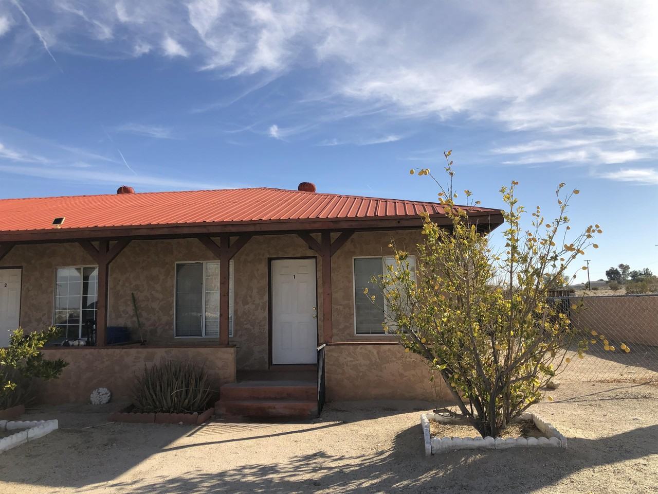 Suitcase Ready! - Fully furnished with water and trash included. 1B1B Adobe style apartment. Shared laundry room behind apt. Surrounded by a stucco wall, private entryway to property. Great view of mountains and surrounding area. Refrig, stove and microwave. Pets considered upon owner review. New Pictures Coming Soon. Located within 7miles from Marine Corp Base and 1mile from Joshua Tree National Park. Parking right in front of apt. Front porch faces west for great sunsets.