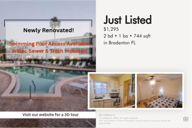 For any questions regarding the property or the rental process please call or text (727) 666-5388 Beautiful 2 beds 1 bath is available for rent in Bradenton, FL. with 10 Stars Property Management Welcome to 1874 Sunny Drive, Unit F32 in Bradenton, a conveniently located rental offering comfort, accessibility, and easy access to Florida's Gulf Coast lifestyle! Situated just minutes from shopping, dining, and everyday conveniences along Cortez Road West, this home also provides quick access to outdoor recreation at GT Bray Park and waterfront relaxation along the scenic Bradenton Riverwalk. Spend weekends soaking up the sun at the beautiful shores of Anna Maria Island or exploring local dining and entertainment throughout Bradenton. With convenient access to major roadways connecting you to Sarasota and surrounding Gulf Coast communities, this Bradenton home offers the perfect blend of comfort, convenience, and coastal living. Features: - Well established 55+ community - Conveniently located on the 3rd floor - Fully furnished home for move in ready experience - Laminated hardwood floors adding warmth, durability, and timeless elegance - Basic kitchen appliances for everyday cooking convenience - Ceiling fans for year round comfort and airflow - Washer and dryer included for ultimate convenience - Inviting bathtub for a relaxing soak after a long day - Building features an elevator for convenient access to all levels - Assigned parking for guaranteed convenience and easy access - Access to community pool for leisure and enjoyment - Water, sewer & trash included - Tenant is responsible for power - Part of an HOA Community No pets allowed per HOA rules. Does not apply to medically/emotional support prescribed and/or service animals. Details on our website: https 10starshomes com rental-guidelines Every applicant 18 years of age or older is required to complete a separate application. Each application is a $65 non refundable fee. A credit and background check will be conducted for all applicants, and management approval is required prior to signing the lease. See all rules and regulations at https 10starshomes com rental-guidelines All residents are automatically enrolled in the 10 Stars Resident Benefits Package at a cost of $7.99 per month. This program was developed to enhance the overall rental experience by providing added convenience, protection, and value throughout the lease term. Enrollment is required and cannot be waived. The package may only be initiated at the time of lease signing or renewal and includes a range of benefits designed to promote a more efficient, flexible, and secure tenancy. Renter's insurance required prior to move-in. Please see the link below for more details: https 10starshomes com resident-forms Renter's insurance required prior to move-in. You may obtain coverage through our third-party provider, Beagle, for $12/month, which includes $100,000 liability coverage and $5,000 in personal property coverage. Please see the link below for more details: https 10starshomes com resident-forms At 10 Stars, we offer multiple services to make your stay with us easy and comfortable. We have a same-day application approval and a quick move-in for no additional cost. Our team is professionally trained and will be able to assist with any leasing, billing, or maintenance issues our tenants have. We also offer an emergency line available 24/7 for any urgent cases. Tenants have access to an online portal where they ..