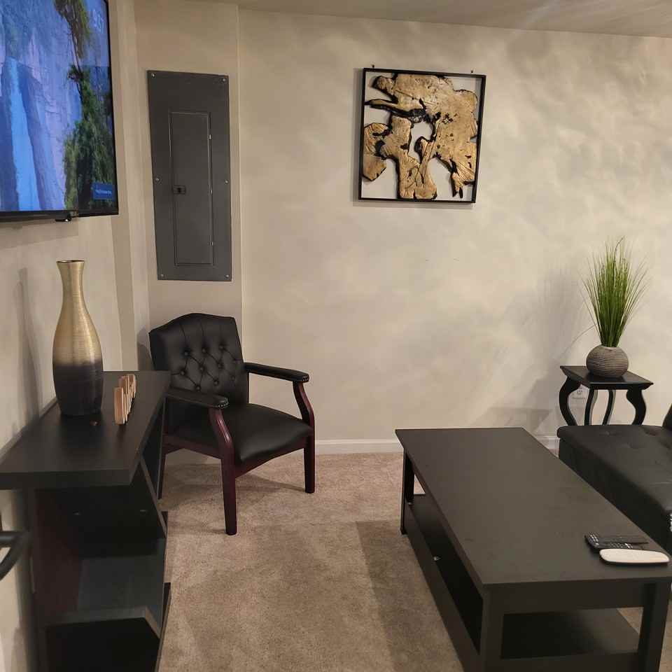 Private furnished Basement suite with kitchenette and private full bathroom, available for rent in Stafford end unit townhouse. Close to 95, Quantico and hospitals. 15 to 20 minutes to Fredericksburg or Woodbridge. Depending on traffic 45 minutes to an 1hr to DC and Richmond. Jeff Rouse Recreation Center nearby and restaurants and shopping. Furnished with queen bed, chair, futon that turns into a twin bed, nightstand, adjustable coffee table that can also be used as a desk and dining, and 50 inch tv. Includes private full bathroom- kitchenette with microwave that is also an air fryer, broiler, and convection oven, instantpot, a sink with garbage disposal and fridge, no dish washer. Shared front door entrance, that goes straight to basement. You do not have to enter the other areas of the home to get to the basement. House is in a quiet new neighborhood, minimum three (3) month lease, no smoking, no drugs, no vaping, no parties, rent includes utilities and internet, parking on street along the side of the house. Shared front door entrance. Best for one occupant. Upper levels occupied and have a separate smart locked door to enter upper levels upon entry into the home. Fenced in back yard, with deck, patio and fire pit that will be available for guest use. No washer or dryer access on-site, laundromat nearby. Close to shopping, Jeff Rouse Community Center, restaurants, Rte 1, 95 and Quantico. Less than 2 miles to Stafford Hospital 10 miles to Mary Washington Hospital 18 miles to Spotsylvania Medical Center 16.7 miles to Massaponax VA Clinic 17.2 miles to Sentara Northern Virginia Medical Center 24.5 miles to Inova Lorton Healthplex Background check, rental history, and credit check required. Separate application fee per adult, signed lease upon approval, first month and security due upon signing, renters insurance required, rent prorated if move in after the first of the month. One occupant includes credit toward the following utilities - electric, gas, water and sewer. Internet and trash also included in the rent. There is a utility cap. We accept credit cards, paypal, venmo, zelle and payments thru avail. Please feel free to inquire with questions. We would love to hear from you! Owner is a licensed real estate agent.