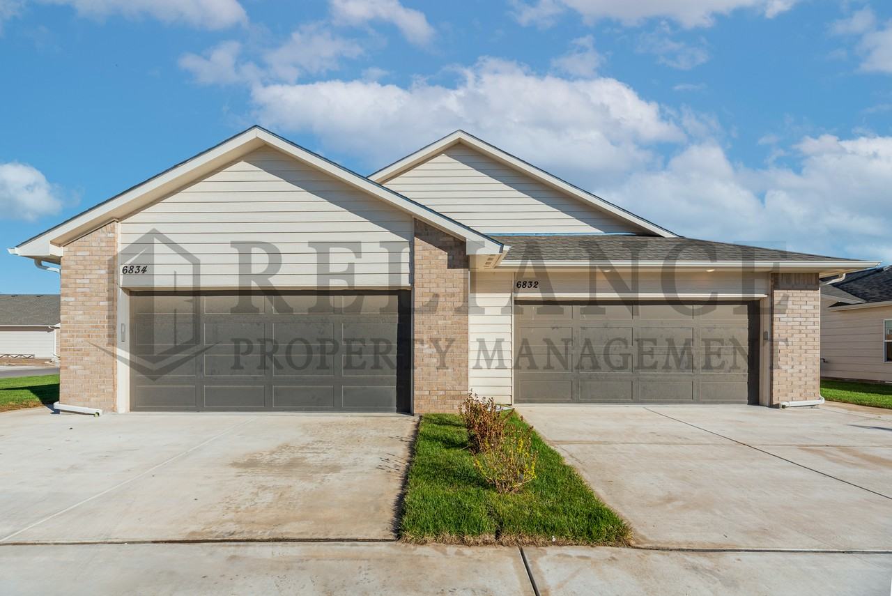 FALL SPECIAL! 1/2 OFF OF FIRST FULL MONTHS RENT! This STUNNING 3-bed, 2-bath home with 2 car attached garage Molly floor plan is located in a quiet neighborhood near Maize schools in West Wichita. It is NEWLY BUILT with luxury materials throughout. If you're tired of old dingy homes listed for rent, this beautiful property will blow you away! Located in a desirable neighborhood near 45th and Ridge, this duplex features a completely renovated kitchen with white shaker kitchen cabinets with modern pulls, quartz countertops, subway tile backsplash, all new stainless steel appliances, including dishwasher and microwave and a Walk in Pantry! The home has two bathrooms, both completely renovated in a modern luxury design with new vanities, quartz countertops, and modern mirrors, lights, new toilets, etc. The Master Bedroom has ceiling fan as well as a walk in closet. The entire home has high-end commercial grade LVP floors that are beautiful, easy to clean, and durable. They look amazing along with the brand new 5" white modern baseboards. All the doors are brand new with modern black hardware. The walls are freshly painted in a neutral light gray with modern white trim and all light fixtures have energy-efficient LED bulbs. This home has plenty of space for your family with nearly 1400 square feet of living space. The main floor has the kitchen, dining and living rooms, three bedrooms and 2 full bathrooms along with laundry room (hookups) The backyard is fully fenced and features water views so you don't have to look into your neighbors backyard. This home truly has it all! Pets are welcome with applicable pet fees, and the application fee is only $35 per adult. BONUS: You will have access to free neighborhood amenities, free mowing and lawn care along with neighborhood playground. Tenant is responsible for all utilities. Trash is provided through Reliance at $24/month. Search Reliance Property Management, Wichita, KS Tenant Turner for more information! Deposit is $1,495 plus a $150 non-refundable move-in fee.