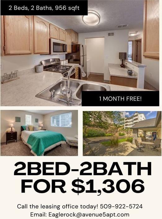 Welcome home to Eagle Rock. Our beautiful community is located in the heart of Spokane Valley. Roomy one, two and three bedroom floor plans offer you a cozy living experience. Each home includes a fully equipped kitchen, washer and dryer in each unit, walk in closets and a balcony to enjoy breathtaking city views. Our onsite clubhouse is the perfect space for your entertaining needs, and our state of the art fitness center provides all the equipment for a successful workout. Our great location is close to various shopping, dining and entertainment. Surrounded by beautiful treed hills, our community offers a peaceful, scenic setting that feels tucked away from the bustle of everyday life. With its natural charm and welcoming atmosphere, it's more than just an apartment-it's a true place to call home.