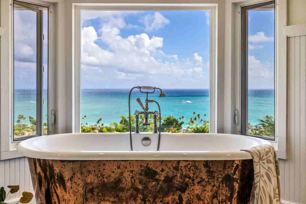 Available 7/10/24 - 11/10/24* Two bedroom, two bath private residence at the top of Lanikai with spectacular, panoramic views of the Kailua coastline. Feel on top of the world in this truly unique hilltop bungalow. Nestled just beneath the Lanikai Pillboxes, a popular hiking trail, Ko’oho’o provides unobstructed views of the Mokulua Islands and the deep blue Pacific beyond. A staircase leads you from the parking area to a large lanai, which the perfect outdoor space to soak in colorful sunrises and to entertain your guests. Enjoy the fragrant plumeria trees and tropical foliage just off your lanai. The lower living area features a fully-equipped kitchen, walk-in pantry, dining nook, living room, laundry room, full bathroom with deep-soaking ‘clawfoot' tub, and guest room with two extra-long twin beds. Upstairs, the luxurious primary suite includes a walk-in closet and wet bar, an updated spa-like bathroom with walk-in shower, copper-wrapped soaking tub, double sinks, and a magnificent, unobstructed view of the ocean. This 400 sq ft suite also includes a large desk space with endless views - ideal for those who must check in with the office. The home is equipped with high-speed internet access and a large flat-screen Smart TV. The Bedroom configurations are as follows: Upper Floor: Bedroom 1 ( 400 sq ft primary suite) - King bed, ensuite bathroom, office space, AC and ceiling fan, with ocean views Lower Floor: Bedroom 2 - Two extra-long Twin beds, AC and Ceiling fan, with ocean views Living Room - Queen sofa bed, AC and Ceiling fan, TV, with ocean views Nearby the property, you will find Lanikai Park and easy access to Lanikai Beach - featured in many publications as one of the best beaches in the world and just a block and a half away. Stroll down 1/2 mile to the sugary-white sand beach and take a dip in the warm, calm, aqua-blue waters of this idyllic setting. Your visit to Lanikai offers something for everyone: Enjoy Kailua Beach Park, rent kayaks or stand-up paddleboards from Kailua Beach Adventures, take a kite-surfing lesson, sip morning coffee from Kalapawai Market, feast on lunch or dinner at Buzz's Original Steakhouse, explore a variety of nearby hiking trails, and visit the many restaurants and retail shops of Kailua Town, approximately 2 miles away. NOTE: pets will be considered with certain restrictions including a mandatory pet deposit. Please inquire further. This Property is professionally managed by Private Homes Hawaii, LLC and is a legally established rental accommodation that is rented for periods of 90 consecutive days or more at any one time. It is compliant with Hawaii State Legislation (HB2078) and is available to lease for 3 months or more: Lic#TA-073-725-6960-01. TMK 1430050430000. *All property rentals under 180 days are subject to mandatory taxes and cleaning fees