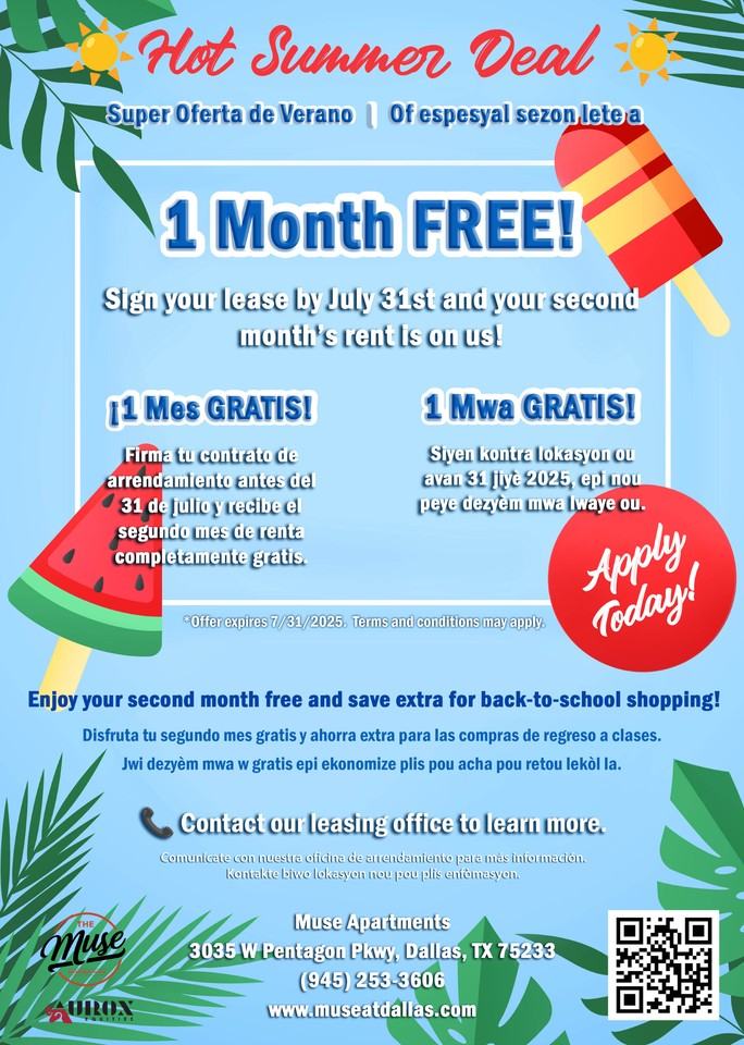 Ready to Make The Muse Apartments Your New Home? Apply online today and secure your spot! 👉 Apply Now: www museatdallas com application 📞 For more information and current pricing, call us at 945-253-3811. Amenities: Balcony or patio, central air, central heat, dishwasher, hardwood floors, stainless steel appliance, updated kitchen, updated bathroom, washer dryer, laundry in building, business center, fitness center, laundry facility on-site, and walk-in closets. Pet-Friendly Security Deposit: $300 No Utilities Included *Prices are subject to change.