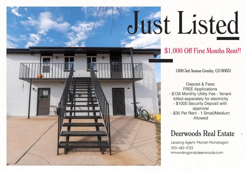 Available Now! ( 9 months lease term to start ) To secure your spot, apply today and make this amazing property your new home! Leasing Special: FREE Applications! Discover comfort and style in this beautifully updated 1-bedroom, 1-bathroom apartment, located in the heart of Greeley. With contemporary finishes, convenient off-street parking, and on-site laundry facilities, this apartment offers a perfect blend of functionality, affordability, and luxury. This modern apartment is ready for you to move in and start enjoying the best of Greeley living. Act fast before it's gone! In The Area - Conveniently situated in Greeley, this apartment is close to local amenities, restaurants, and parks. Commuting is easy with quick access to major highways, providing a seamless connection to surrounding areas, Natural Grocers, Dutch Bros Coffee, Santeramo's Pizza House & Italian Food, Rio Grande Mexican Restaurant, Walgreens, Banner North Colorado Medical Center, Lincoln Park, Sunrise Splash Park Highlights: - Modern & Newly Renovated 1 Bed / 1 Bath Apartments - New Stainless Steel Kitchen Appliances - New Flooring Throughout - Bright Natural Light Throughout - Large Parking Lot Included - On Site Washer & Dryer Steps From Apartment - Shared Front and Back Yard - Storage Unit - Convenient Location Close to Many Amenities Deposit & Fees: - $45 Application Fee - $135 Monthly Utility Fee - Tenant billed separately for electricity - $1000 Security Deposit with approval - $35 Pet Rent - 1 Small/Medium Allowed - $1,000 Off First Months Rent We're offering a net-effective rent of $1,014/month for 9 months. Please note, the lease will state the original rent price of $1,125/month. Must Pass Criminal and Eviction Checks - For more details of our qualification requirements, please visit our website! Applicant has the right to provide Deerwoods Management with a Portable Tenant Screening Report (PTSR) that is not more than 30 days old, as defined in § 38-12-902(2.5), Colorado Revised Statutes; and 2) if Applicant provides Deerwoods Management with a PTSR, Deerwoods Management is prohibited from: a) charging Applicant a rental application fee; or b) charging Applicant a fee for Deerwoods Management to access or use the PTSR.