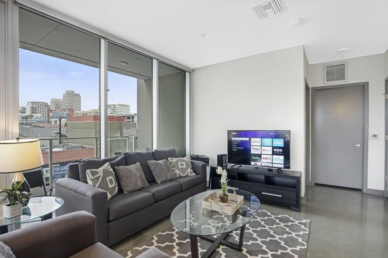 Feel at home in this modern-style Glendale apartment, built in 2015. The unit features a cal-king bed in the master bedroom and TVs in all bedrooms. Ideally located next to the popular upscale Americana outdoor shopping mall, it offers easy access to a variety of shops, restaurants, cafes, retail stores, and a supermarket inside Target. The apartment is also conveniently situated near major movie studios such as Disney, NBC, ABC, and Universal, as well as Burbank, Children's Hospital, Pasadena, and is only 10 miles north of Downtown LA and Dodger Stadium. This apartment includes a full-size washer and dryer, two gated assigned garage parking spaces with direct elevator access, and a private high-speed Wi-Fi network at 500 MBU to 1GB with a desk and printer included. Entertainment options include RokuTV with YouTubeTV streaming cable TV and Netflix, and TVs in all bedrooms. The neighborhood is ideal for those who prefer walking, as it is located in the heart of Glendale's most popular area. You will find a huge variety of shops, restaurants, cafes, and a movie theater within walking distance. The 5 Freeway is the closest, providing easy access to Downtown, Pasadena, and Burbank Movie Studios. There is also a shortcut to Hollywood. You will have direct cell phone numbers for assistance with any questions, additional requests, maintenance work orders, emergencies, and extension requests, available any time including evenings and weekends. The building management requires compliance with community rules, including no loud music, noise or disturbances, being discreet, quiet, and polite to other residents and property management, no cigarette smoking inside or in the building common areas, and no marijuana odor coming from the apartment into common areas. Includes a desk and printer.