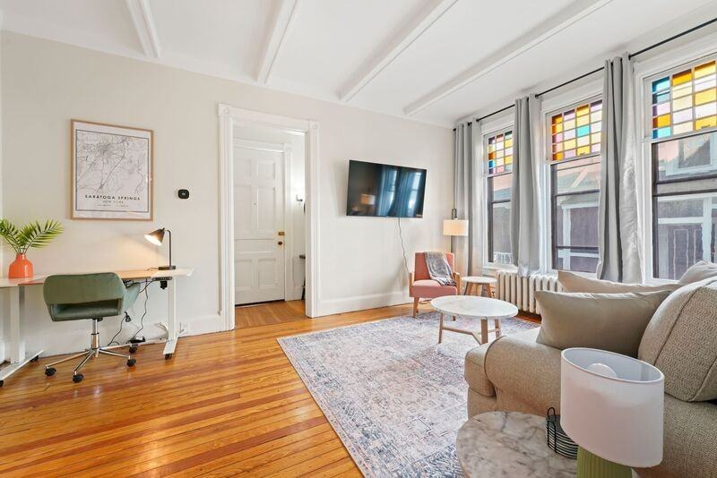 FULLY FURNISHED!! - Available thru May'25! This gorgeously restored first floor 2bed/1bath, 750ft² apartment is overflowing with totally renovated historic character and charm, designed and curated with optimal comfort, character, relaxation and home away from home conveniences in mind. Bursting with unique historic character inside and out, starring incredible hand made stained glass window panes, this Saratoga Stay by Green Springs seamlessly exudes both a cheerful brightness and a cozy calm thanks to the generous natural light, interior refreshes and thoughtfully chosen textiles. We have carefully outfitted the space with all of the accommodations you’ll want or need for relaxing, cooking, dining, sleeping, bathing, web surfing, conversing or even working. Positioned in the heart of downtown, walkable to downtown or the Saratoga Race Course, this location, easily accessible to the best Saratoga has to offer, can’t be beat. Interior Virtual Tour: https bit ly StainedGlassRetreatInteriorTour Aerial Exterior Video: https bit ly UnionExteriorVideo ●Heat/ AC, TV, Wifi ●Laundry -shared/on site ●Fully outfitted kitchen ●Towels/linens provided ●Furnished private balcony ●Work from home accommodations – height adjustable desk! ●EV Chargers on site ●Coffee, groceries, movies, dining a few short blocks. ●Pet Friendly ●Pet waste station ●NONsmokers Strictly! ●4 person Occupancy max NEIGHBORHOOD: This property is ideally positioned between a quiet neighborhood on the backside and the invigorating bustle of Saratoga from the front. Mere blocks of easy walking to either Saratoga’s race course or downtown Broadway’s shopping, dining, parks and nightlife. Given the downtown location there is potential for related audible noise. Complimentary earplugs available to accommodate guest preference. LAYOUT: https bit ly StainedGlassRetreatInteriorTour BEDROOMS: For sleeping there are two bedrooms each outfitted with a Queen bed with plentiful pillows and warm cozy seasonal layers. KITCHEN/ DINING: For meal time there is a high top kitchen table for 4 complete with place settings, plentiful bakeware and cookware as well as a shared outdoor grill for a wide variety of culinary prep wants and needs. BATHROOM: For bathing there is a beautiful newly renovated full tub/shower bath stocked with beauty care basics and plentiful bath linens. RELAXATION: For indoor relaxation you’ll find board games along with Smart TVs powered by free high speed internet, complete with basic cable loaded with streaming services apps ready for personal login access. OUTDOORS: For outdoor enjoyment there is a grill on that back porch for use in our shared outdoor space. Additional outdoor amenities coming soon. LAUNDRY: Property shared coin laundry room available for use during your stay. ACCESS: This is a multi unit property with a common front/back door. You have a private secure smart lock entry accessible just inside the rear entrance, steps from the parking lot. The entire unit is yours and in no way accessible to any other building occupants. PARKING: ●1 off-street parking space ●Free on-street parking *ANIMALS: ●Animal friendly - max 2 ●≤50lb total animals weight limit ●https saratogastays com pet-policy PROXIMITY: ●Taxis/Designated Driver Services/Uber/Lyft – readily available ● Saratoga Race Course .5mi ● Downtown Saratoga Dining/ Shopping 1mi ● Rood & Riddle Equine Hospital 1.5mi ● Saratoga Hospital 2mi ● Skidmore College 2mi ● SPAC 3mi ● Global Foundries ..