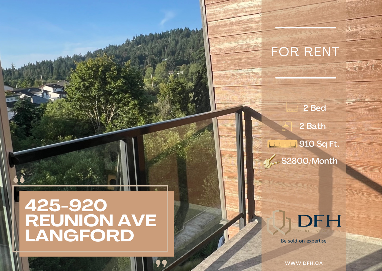 {2-BD/2-BTH} {$2800} {910 SQ FT.} We are thrilled to announce that our 2-Bd unit situated in the highly modern and stunning Reunion building from MyBelmont is available to rent! Located in the rapidly growing and highly sought after city of Langford, and close to everything you could possibly want, this unit has it all! The building is amenity rich with a gym, access to the Belmont club, parking, storage locker, AC, pet wash, outdoor terrace with BBQ, meeting room, and party room! If that wasn’t enough to whet your appetite, the condo is also on the galloping goose trail and within walking distance to Thrifty Foods, restaurants and cafes. The condo has a spacious layout, letting in an abundance of light and it contains the finest energy efficient and sustainable appliances, such as Energy Star refrigerator and dishwasher. The balcony has stunning views of the area and nature which you can enjoy as you sip on your coffee, taking in the morning sun or drinking a glass of vino at the end of a long day of work. Get in touch with us today for a showing before this beautiful unit gets snapped up! *Pets Negotiable *Included in Rent (Water, Garbage pickup, parking, storage locker) *Not Included (Hydro, Phone, Internet) *A/C in unit DFH REAL ESTATE LTD.