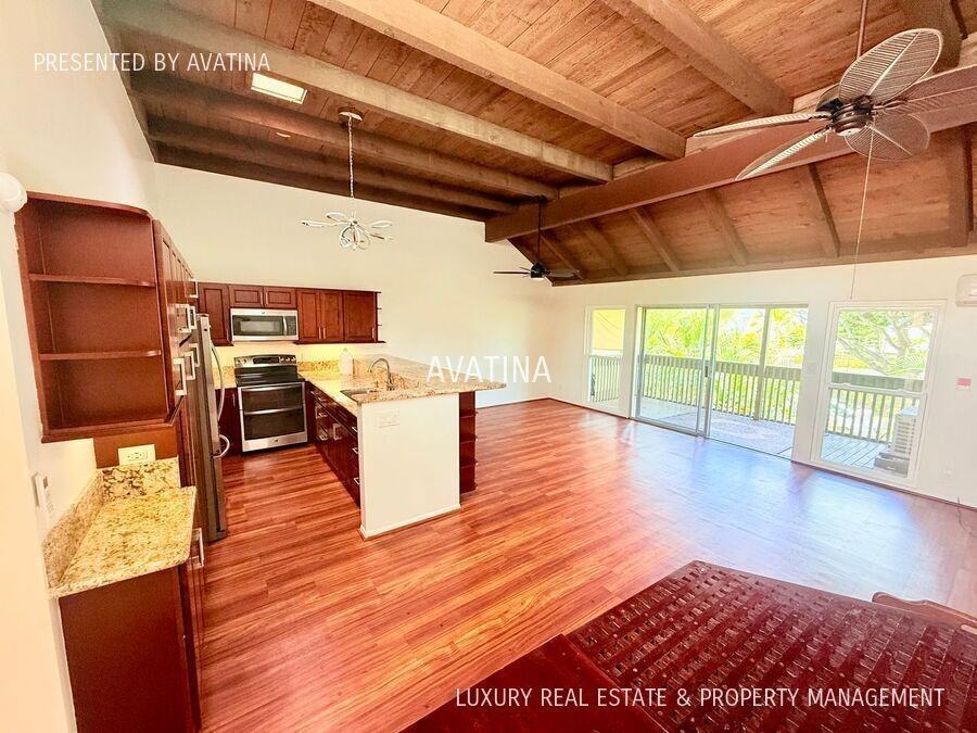 Check out this two story Yacht Club Knolls townhouse! Enter through your private fenced patio which the perfect hideaway. Inside you will find the dramatic vaulted and beamed ceilings, split AC cooling the large living and dining areas which opens up to a huge covered deck! What a nice place to relax! The chef's kitchen has granite countertops, plenty of cabinets, a big eat in bar, plus modern appliances to make living easy! Tucked off the entrance hall is the full size washer dryer, a full bathroom and bedroom #1 with full size closets and private patio! Downstairs are two more bedrooms each with access to the covered lanai! Both bedrooms have full size closets and share a hallway full bathroom. There is even a large bonus storage room or workshop area downstairs! The two parking stalls included plus tons of guest parking right outside. Perfectly located near the shops and restaurants and easy freeway access! This home truly is a must see! YouTube Tour: coming soon! 3D Virtual Tour: coming soon! Schedule Showing Online at: https www avatinapropertymanagement com availability Or call: (808) 645-4490 Address: 44-3082 Olina St #5/2 1 yr lease, Rent = $4,100.00 a month plus $15.50 Liability to Landlord Insurance & credit reporting fee, Security Deposit: $4,100.00. All rents & security deposits are due at signing. Liability to Landlord and Renters Insurance required. $20.00 application, $100.00 one time onboarding fee with approved application. Pets allowed with a monthly pet fee of $100 and a $500.00 pet security deposit per pet. Services included, water, sewer. Presented by Avatina - Luxury Real Estate & Property Management Bbq Area Community Pool/Cabana Private Yard Recreation Area Refuse Resident Manager Sewer Walking/Jogging Path