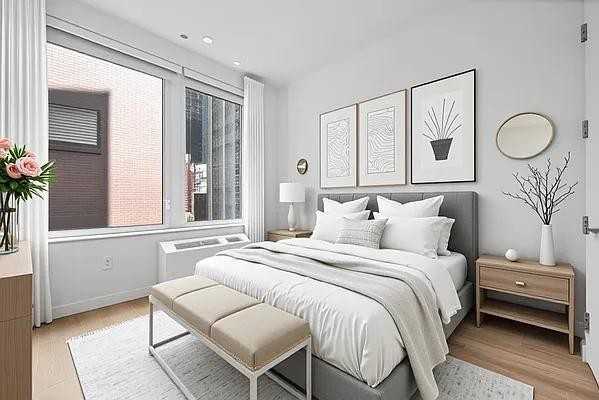 This stunning apartment offers a spacious and light-filled modern design. Large windows provide ample natural light, complementing the neutral tones and sleek finishes that define the space. The open floor plan allows for seamless movement between the kitchen, dining, and living areas, ideal for those who enjoy entertaining or simply love the feeling of an expansive living environment. The apartments contemporary design is enhanced by cutting-edge appliances and high-quality materials, creating a chic, polished space that feels both luxurious and welcoming.