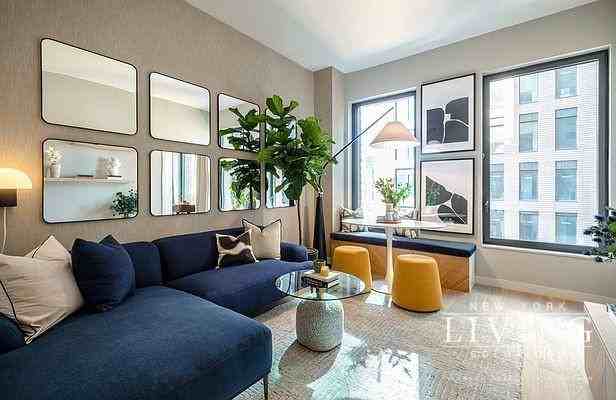 1 bed 1 bath featuring 15' floor to ceiling windows, L lined gourmet kitchen, Bosch appliances including washer/dryer in unit, spacious living room, massive walk-in closet, Oak wood floors, and elegant bathroom with polished chrome fixtures with mirrored cabinets. Apartment includes Smart Home Keyless Entry and central air via Nest thermometers, Amenities feature 24 hour doorman and concierge, elevators, lobby lounge, state of the art fitness center, resident lounge with outdoor courtyard, landscaped rooftop deck with BBQ grills, rooftop swimming pool with lounge chairs, media room, storage available, package room, pet-friendly, and on-site maintenance. Steps to the 1 Train and easy accessibility to C/E/2/3 Trains.