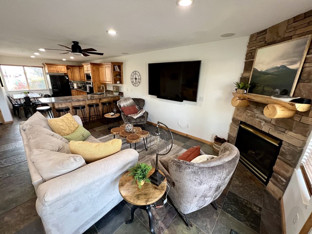 Welcome to your spacious Eden retreat—where modern comfort meets scenic mountain views and room for the whole crew. This upgraded Moose Hollow condo in Eden, Utah, is one of the most expansive and well-equipped rentals in the area, offering a rare mix of privacy, cozy charm, and thoughtful amenities for families, ski groups, and remote workers alike. With 3 bedrooms, 3 bathrooms, and accommodations for up to 11 guests, there’s plenty of room for everyone. Each bedroom has its own bathroom and smart TV, with flexible sleeping arrangements that include a Cal King suite with a fireplace, a Queen suite, and a group suite with twin XL bunks, twin bunks, and a Queen sofa sleeper. Perfect for both work and play, the condo includes two dedicated desk workspaces, high-speed Wi-Fi, and inspiring mountain views to keep you productive and grounded. The fully loaded kitchen is ready for real cooking, featuring double ovens, a cooktop, dishwasher, Ninja blender, Keurig, filtered water, bakeware, spices, and pantry staples. Entertainment is built in, with four smart TVs, fireplaces in the main living area and two bedrooms, plus family board games, books, and cozy reading nooks. Enjoy coffee on the private balcony, stargazing, or après-ski wine on the patio. Extras that matter include a private ski storage locker, in-unit washer/dryer (with detergent provided), linens and toiletries, free front-door parking plus nearby trailer parking, and professional cleaning between each stay. The Moose Hollow community also offers year-round amenities just a short walk away: a hot tub, seasonal pool, game room, fitness center, frisbee golf, sand volleyball, BBQ areas, and scenic trails. Located for adventure, the condo is just 10 minutes from Powder Mountain and Nordic Valley, 20 minutes from Snowbasin, 10 minutes from Pineview Reservoir, 30 minutes from historic Ogden, and 60 minutes from Salt Lake City International Airport. This is the mountain basecamp you’ve been searching for.
