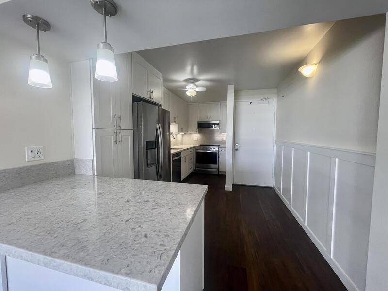 Gorgeous 2 bedroom and 1.5 bathroom condo in Marina Towers! Fully remodeled spacious unit in a secure building! Short walk to the beach, Ala Moana Center, restaurants, entertainment, public transportation, and more! Enjoy the city, ocean, and mountain views from this bright and airy living room as well as both bedrooms! Large floor plan, with lots of added storage, and built-in. Enjoy two lanais both with beautiful views. This unit is situated on the breezy side of the building with wonderful tradewinds. Unit includes 1 garage parking, AC in the master bedroom, ceiling fans in every room, luxury vinyl flooring throughout the unit and Quartz countertops in kitchen and bathrooms. The unit comes with all new stainless steel kitchen appliances: refrigerator, microwave, oven/range, dishwasher. New full size in-unit washer/dryer. There is also a bonus secure storage area downstairs. Enjoy free access to the pool, gym, BBQs and recreation area. Rent includes water, sewer, trash, internet and cable.