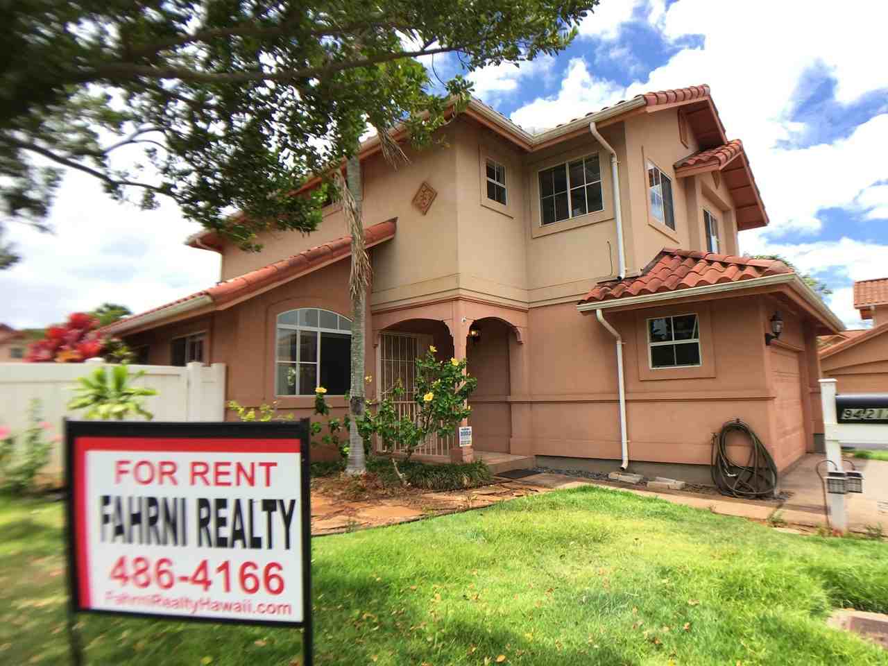 This Beautiful 3 bedroom 2-story single-family home on a desirable corner lot with a 2-car garage. This home features a modern kitchen with stainless steel appliances, glass-top stove, black granite countertops, and solid wood cabinets. Flooring includes laminate wood, ceramic tile, and carpet. Enjoy central A/C, washer & dryer, and a high vaulted ceiling in the living room. Relax on the covered lanai and take advantage of the fenced yard. Fantastic location near Waikele Premium Outlets, golf course, shopping, dining, and with easy access to H-1 Freeway and Kamehameha Hwy. Rental Terms: Tenant pays for water, sewer, electric & cable Renter’s insurance required No pets, no smoking, no vaping Apply online @ www fahrnirealtyhawaii com Fahrni Realty, Inc. RB#7761 98-277 Kamehameha Hwy Aiea, HI 96701 808-486-4166. www fahrnirealtyhawaii com