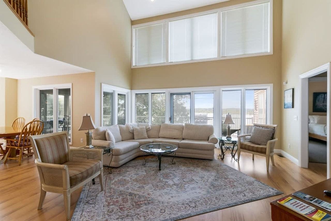Feel at home in The Lookout, a 3-level home offering the perfect setting for a family getaway or group retreat, accommodating up to 12 guests. Enjoy Lake Barkley views from the back deck and almost every room, and quick access to the water nearby. This home features an open-concept kitchen, living, and dining area, a game room, a theater room, a laundry room, and an office. The fully stocked kitchen includes a double-door refrigerator, stainless steel oven and stove, microwave, built-in dishwasher, coffee maker, and island counter seating. Some amenities, such as a Pack 'n Play, are available upon request. Enjoy the hot tub. Nestled on Lake Barkley’s tranquil shore, this lakeside retreat blends modern comfort with nature, offering private dock access, forested views, sunrise over the water, and easy drives to local cafés and nearby trails. It's ideal for families or couples seeking kayaking, fishing, or quiet evenings by the fire with panoramic sunset vistas. Check-in is at 4:00 PM and check-out is at 10:00 AM. Early check-in and late check-out requests are subject to availability, with fees starting at $60. Strictly a no-pet policy at home. Any noise complaints or law enforcement calls to the home will result in immediate termination of your stay without a refund.