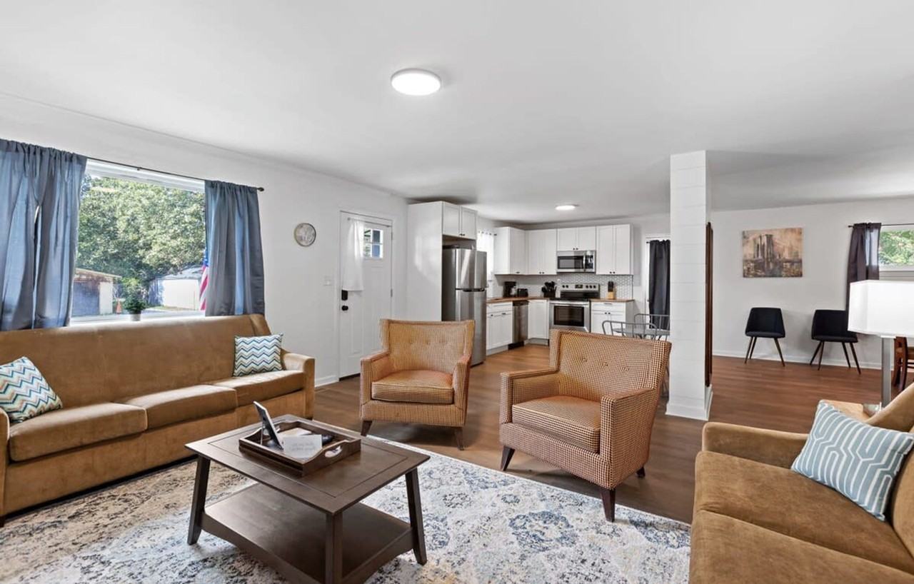 This mid-century modern stunner is perfect for your stay in Chattanooga! This home sleeps eight in its three bedrooms with room for four more on the sleeper sofa in the living room. There is a spacious backyard with a grill and a picnic table to enjoy the cool mountain air. Conveniently located, it is just 5 minutes from the Chattanooga Zoo, a 5-minute drive to Overlook Park, and 10 minutes to downtown attractions like the Tennessee Aquarium, Bluff View Art District, Chattanooga Lookout Stadium, and endless shopping. You'll enter the home through the front door with a code provided at check-in. The open concept main living space greets you upon entry. The living room with two sleeper sofas is on your right and the fully equipped kitchen is on your left. Just past the kitchen is the dining room with an accent wall and mid-century modern vibes. Down the hallway are the bedrooms and bathrooms. The master bedroom features a king bed and en-suite bathroom. The second bedroom has a queen bed and there are two full beds in the third bedroom. There is a shared full bathroom in the hallway. The laundry room is in the back of the house with a half bath next to the washer and dryer and access to the backyard, where a grill and picnic table are available for your use. Pets are welcome with a non-refundable pet fee. Pets must be crated when left unattended in the home and are not allowed on furniture or beds. All waste must be cleaned up from the yard. If there is evidence of pet hair on the furniture, excess hair in the home, stains, or waste found in the yard or home, you will be charged the cost to clean this. There are so many activities the city has to offer, ensuring you'll never run out of things to do and see, all with the comforts of home right at your fingertips. This home is located in a transitioning neighborhood. Some guests have expressed concerns, but we love our family-friendly neighborhood and have never had any security issues. Quiet hours are between 10 PM and 7 AM. If violated, your reservation may be canceled without a refund. Smoking is prohibited, and a $500 damage charge will be incurred if signs of smoking are found. Parties are not allowed, and any damage to the home or its furnishings will be your responsibility. Trash must be bagged and placed in the bins provided, with a $100 charge for excessive trash removal. We offer contact-free check-in via a digital door code, providing a sense of privacy and security. A ring security system is also installed for added security.