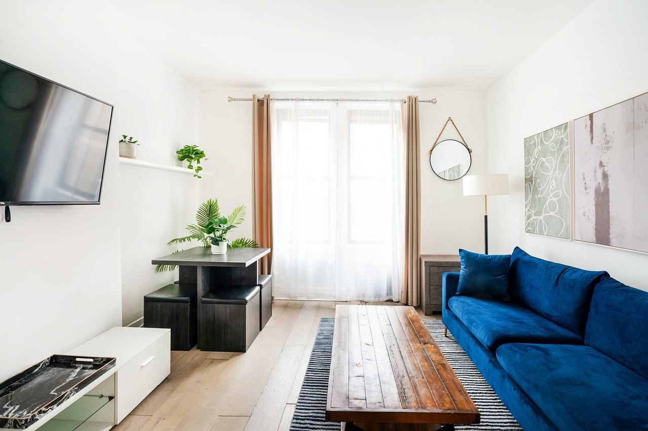 Feel at home in this gorgeous and spacious 2-bedroom apartment located in prime Midtown West. This modern boutique building features video intercoms and a security system, ensuring a comfortable and secure living experience. This apartment is completely newly renovated and newly furnished, designed with great emphasis on comfort and luxury. The kitchen is fully equipped with new appliances, countertops, and cabinets. Enjoy the modern and chic bathroom, spacious and warm living area with a flat-screen TV, queen-size sofa, and designated desk work area. The bedroom features a queen-size luxurious bed and great closet space throughout the apartment. Wi-Fi and cable are available, along with fresh linens, towels, and extra pillows. Located in the perfect spot for work or pleasure, this apartment is surrounded by museums, cafes, delis, restaurants, gyms, bars, pubs, live music venues, and the lovely Hudson Highway boardwalk. Subway station lines are conveniently situated all around, with Central Park, Hell's Kitchen, Rockefeller Center, Times Square, Broadway theaters, 5th Avenue shopping, Time Warner Mall, and the culture-packed Lincoln Center just steps away. New York City's heating season is until the end of May. Beginning around mid-April, window air conditioning will be installed in the apartment. You can request an earlier installation if needed.