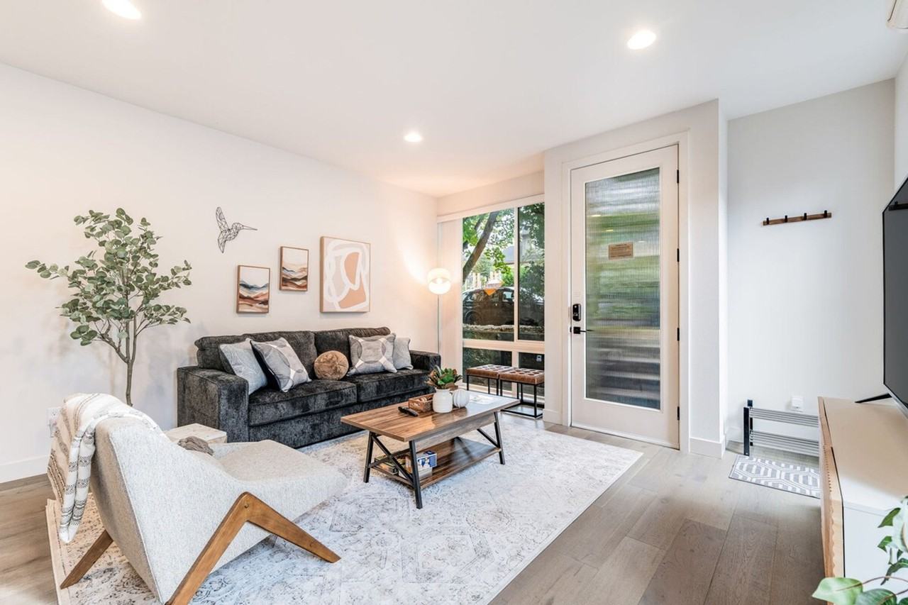 Feel at home in this charming, modern 3-bedroom Eastlake townhome, your gateway to a memorable Seattle adventure. This spacious 1580 sqft home is spread across four stories, including the rooftop patio, and is accessed via a staircase walkway from the parking area. This tastefully furnished home features a kitchen stocked with high-end appliances, cookware, silverware, servingware, spices, Keurig coffee, and tea. Enjoy high-quality beds, mattresses, pillows, and linens for comfortable sleeping, as well as an on-site washer and dryer for your laundry needs. A smart TV is available for streaming. The first floor is air conditioned, the primary bedroom suite on the third floor is air conditioned, and there is portable AC available on the second floor during the summer. Dedicated parking is available in the back of the complex. Located in the heart of Eastlake, you're just minutes away from city icons. Eastlake is a low-key, funky area with brightly colored homes and small businesses right by the water, offering amazing views. It's fun to walk around, with plenty of cafes and restaurants within walking distance. Bus stops are less than a 5-minute walk away, and ride-share services are highly recommended for exploring other parts of Seattle. This townhome is not handicap-friendly, and guests must be comfortable with stairs. This is not a pet-friendly home, and unauthorized pets will incur a $500 fine. Parties and events are strictly prohibited, and quiet hours are between 10 pm and 8 am. Smoking or vaping of any kind is not allowed anywhere on the property, including outdoor areas, and digital piracy and wearing shoes in the home are prohibited; each violation will incur a $500 fine. One of the bedrooms on the second floor has a dedicated desk with a monitor and fast internet, perfect for remote work. Registration Number: STR-OPLI-23-001356